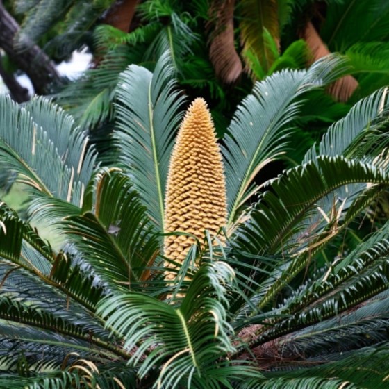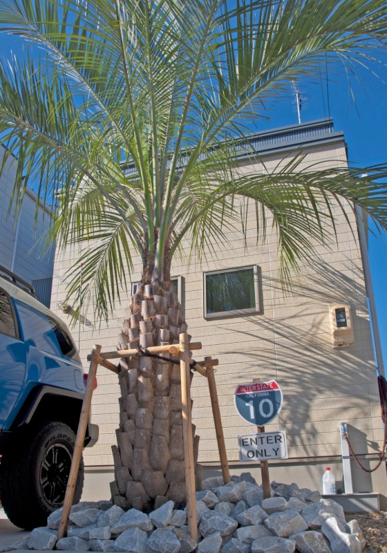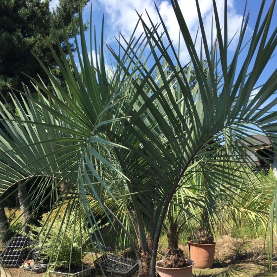 ヤシの仲間では耐寒性のある常緑樹。葉が細長く、硬いため下に垂れ下がらないのが特徴。5月ごろには、クリーム色の花を咲かせて実をつけます。秋には黒青色に変化し熟します。枯れた葉を取り除くくらいで、ほとんど手のかからない品種です。