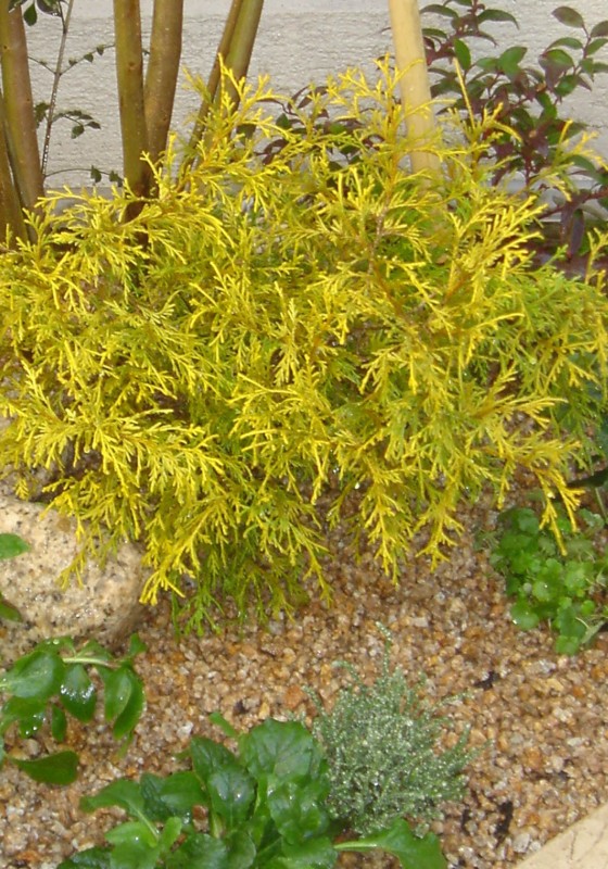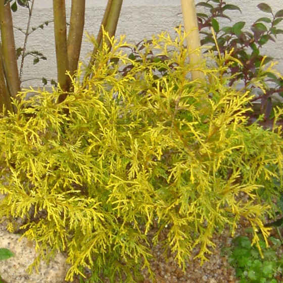糸状の美しい黄金色の葉が特徴。垂れ下がった葉が地面を這うように育つためシンボルツリーの足元にボリュームを出したい時にお勧めです。冬の寒さにあたるとより綺麗に色付き明るい雰囲気にしたい時に一役買ってくれます。