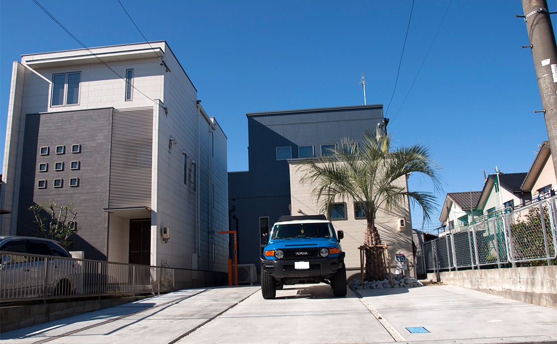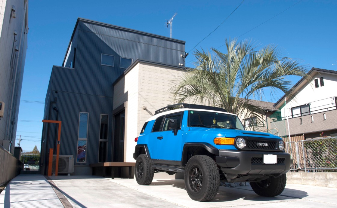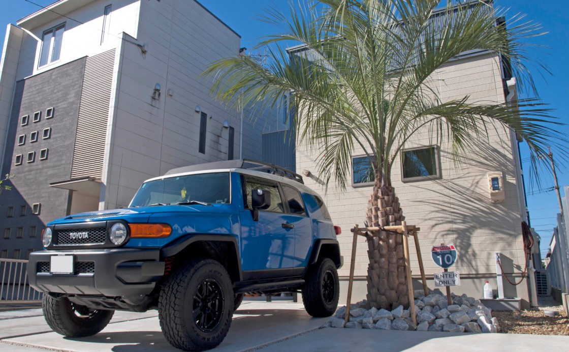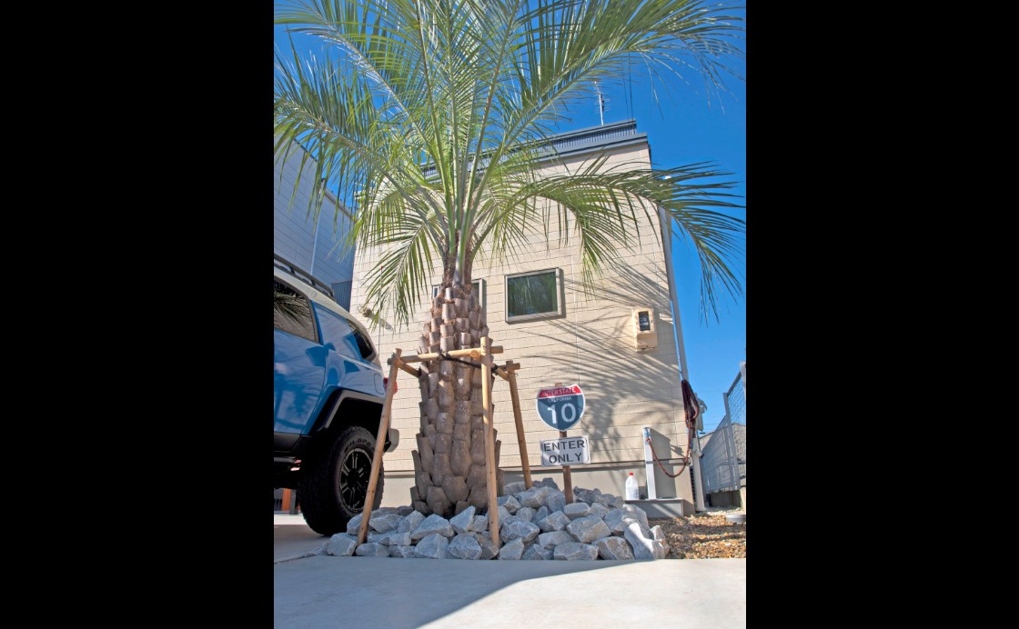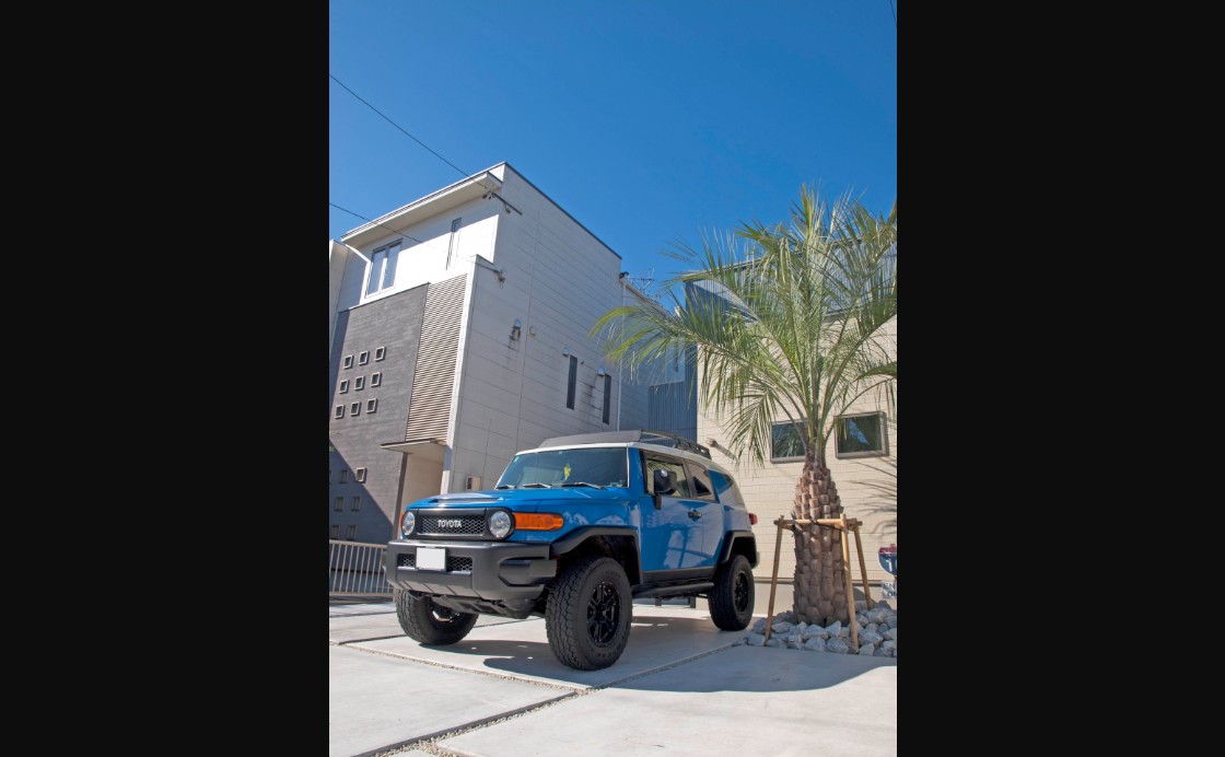 周りに高い設備は設けず広くみせることでヤシの木をより強調させたアメリカンスタイル。車の色が強調されるよう、アプローチやフェンス、石などは落ち着いた色で統一し、特徴的なフェンスを使用してアメリカンスタイルを確立しました。基本的にシンプルな外構プランではありますが、特徴的なデザインに仕上がりました。