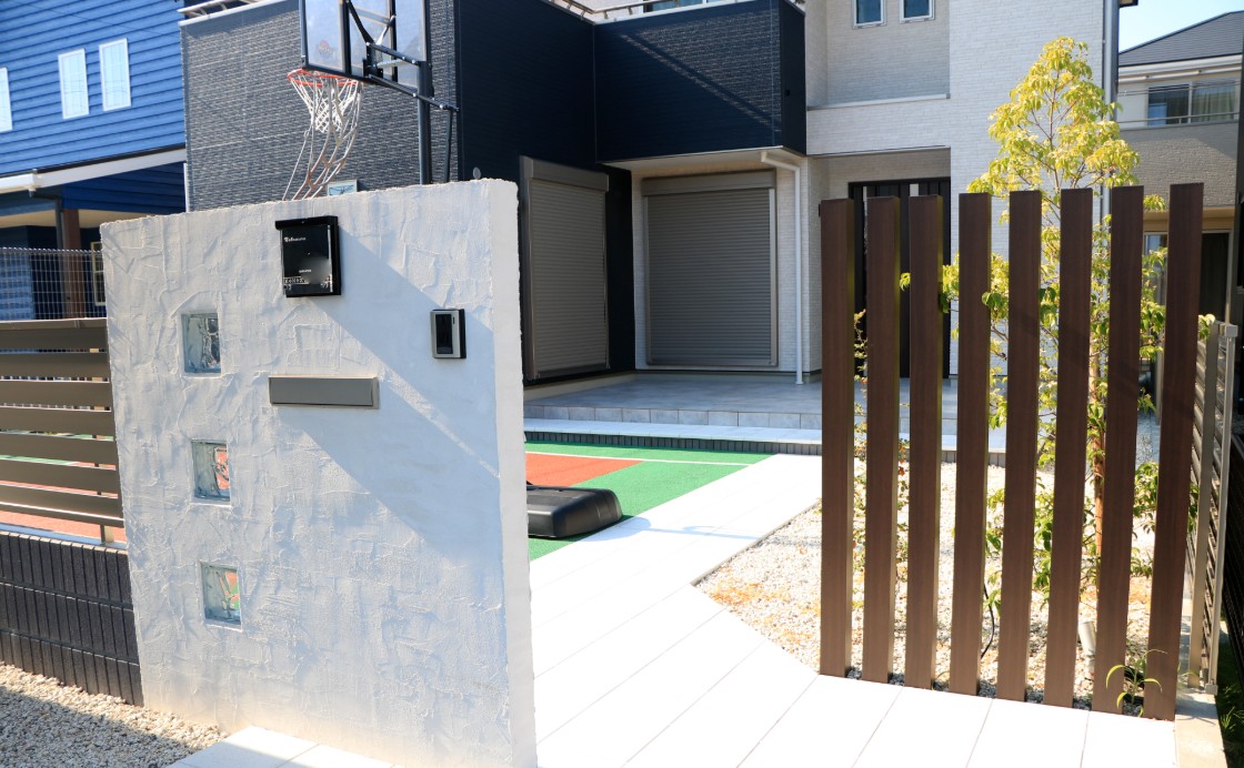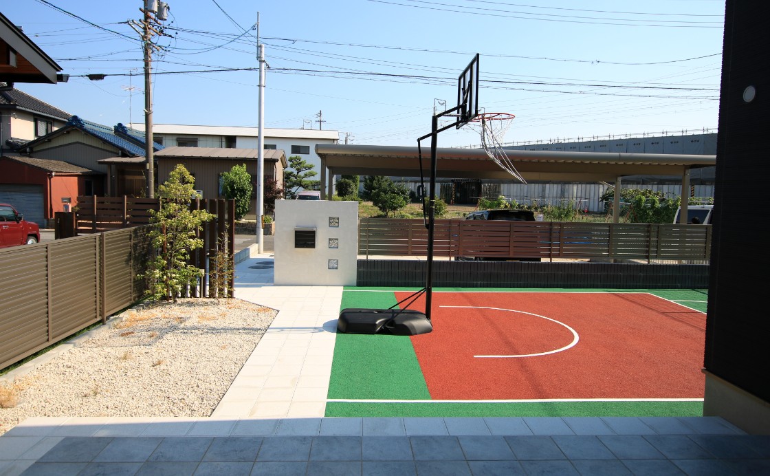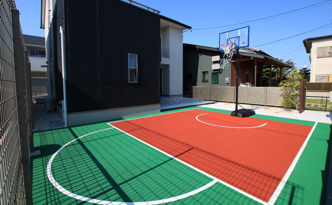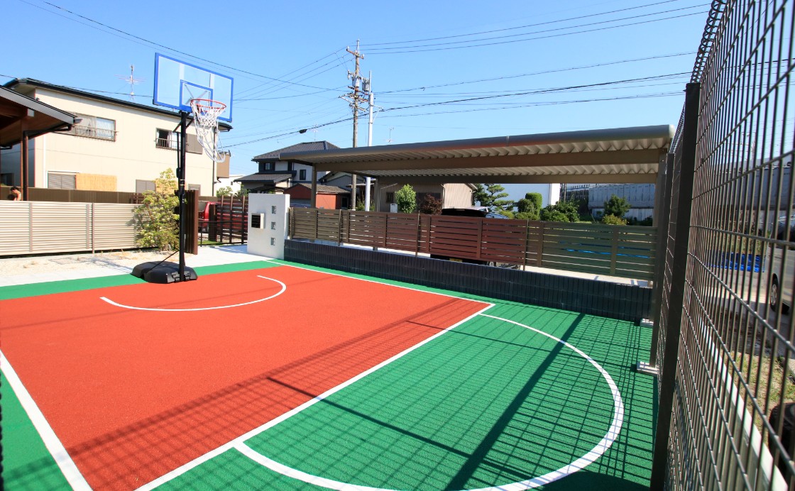 オレンジとグリーンが目を引くバスケットコートを自宅の庭に設置した自分だけのスタイル。また素材には陸上競技場などで使用されるゴムチップを採用し、適度なクッション感と心地よい歩行感が特徴です。フェンスは高さを設け、カーポートやファサードは広くとり余裕のある大きさにすることで使用感についてもこだわりました。