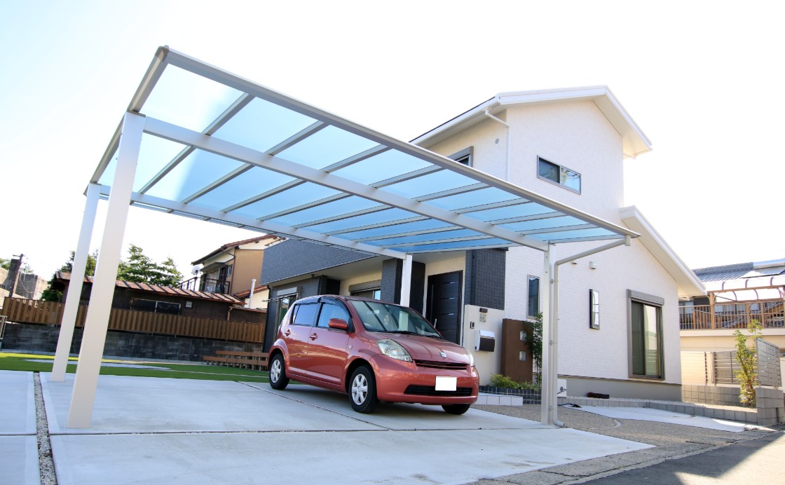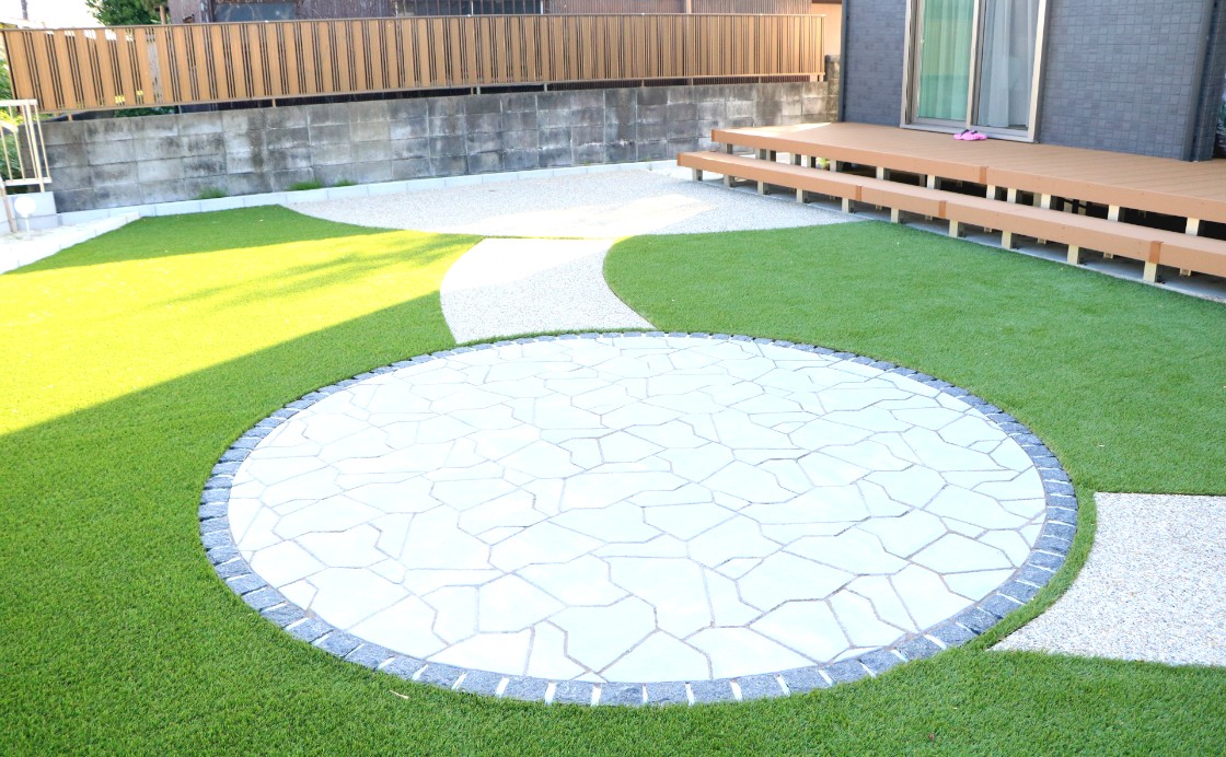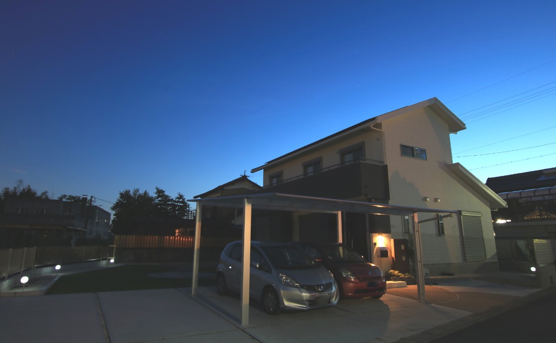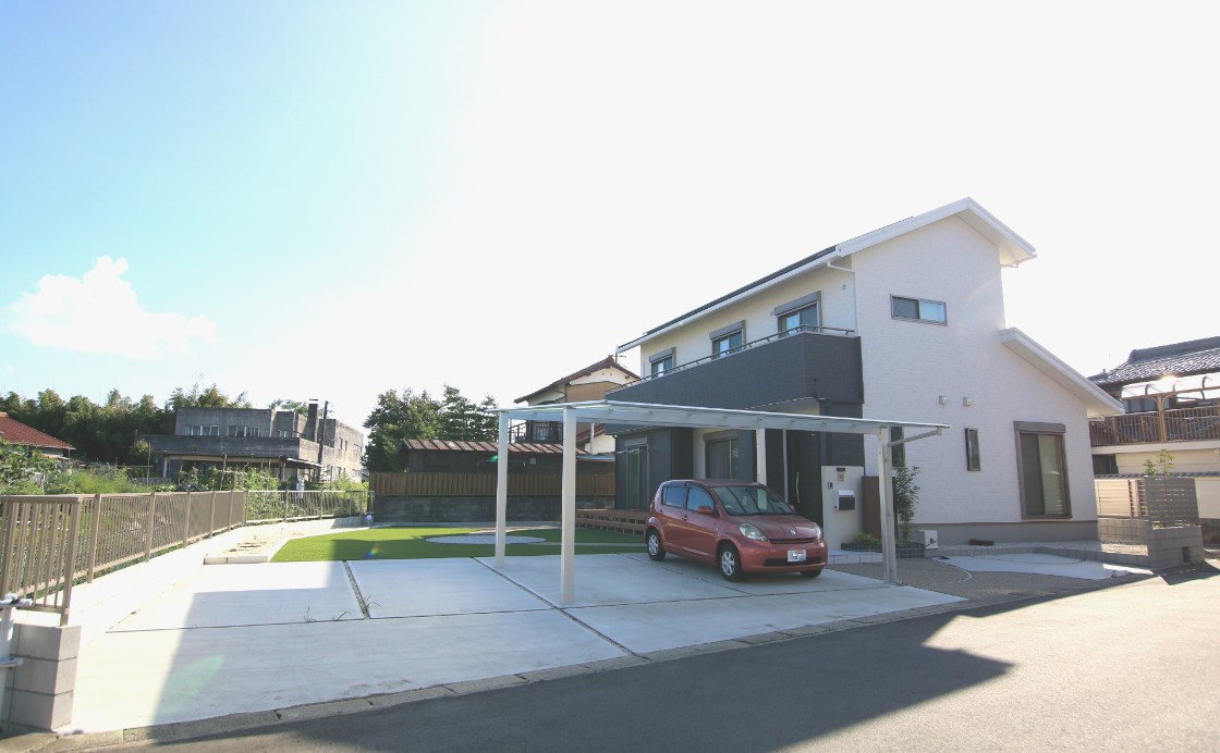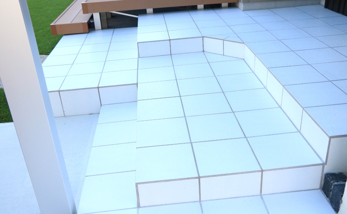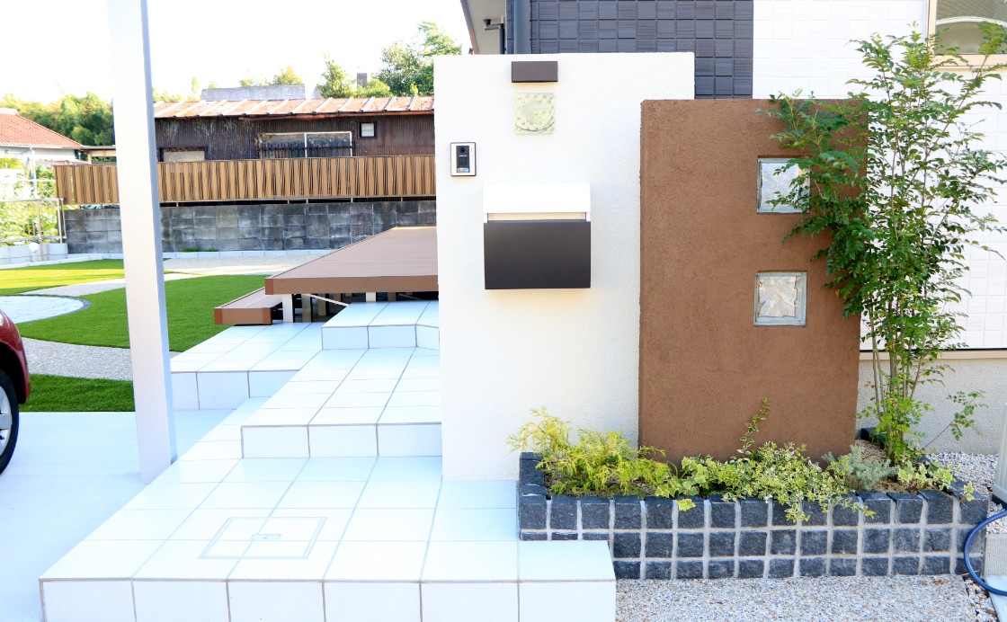 アプローチ、駐車場、お庭、またウッドデッキの階段としても使用を想定した特徴的なタイルポーチ。どこからでも使用できるよう考案した階段は抜群な存在感を発揮し、また2色使いの門柱はシンプルながらも個性的なデザインに。もちろんウッドデッキやカーポートは大きめにゆったりと使用でき、お庭には人工芝の中にBBQ用のスペースもご用意いたしました。
