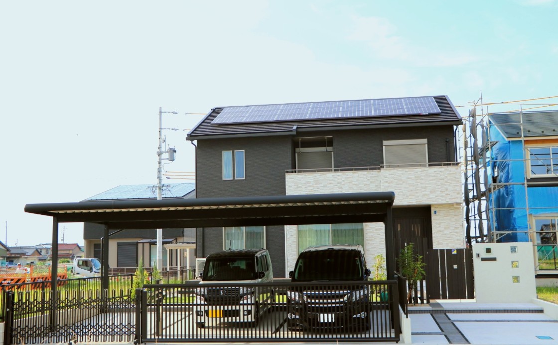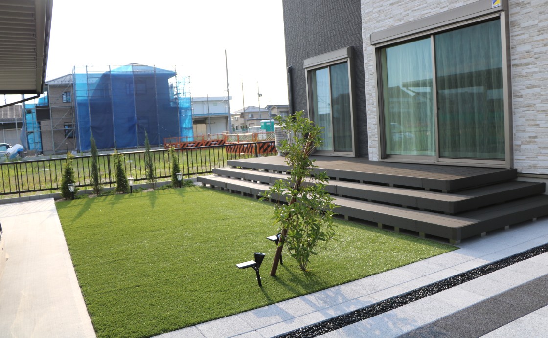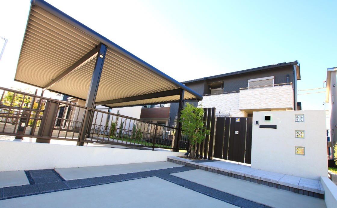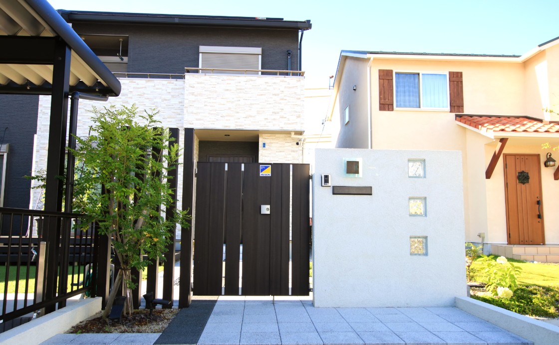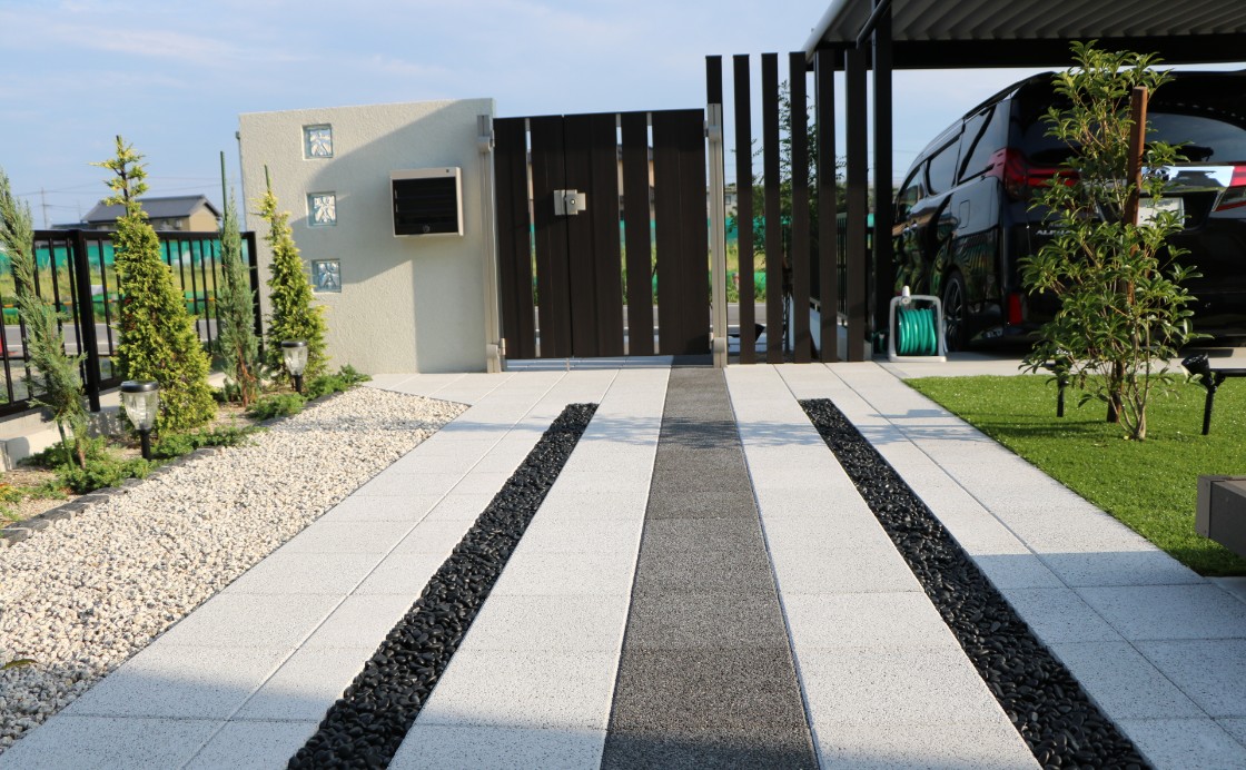 クローズ外構としてアップゲート・伸縮ゲート・、門扉を設け、その他にカーポート・ウッドデッキと様々な設備を搭載したプラン。ご住宅に合わせ黒と白でまとめることにより、明暗のコントラストが際立ち、アプローチには平板の中に黒い玉砂利を入れることにより引き込まれるようなデザインになりました。
