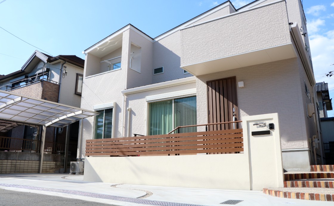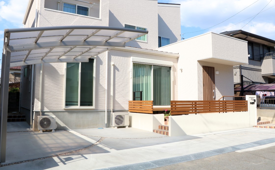 シンプルモダンなご住宅に、フェンスやウッドデッキを木彫色で取り入れ、階段部にはランダムカラーのレンガを使用しました。お車は3台停められるようプランニングし、シンプルでさわやかながら、階段部が特徴的なデザインに仕上がりました。