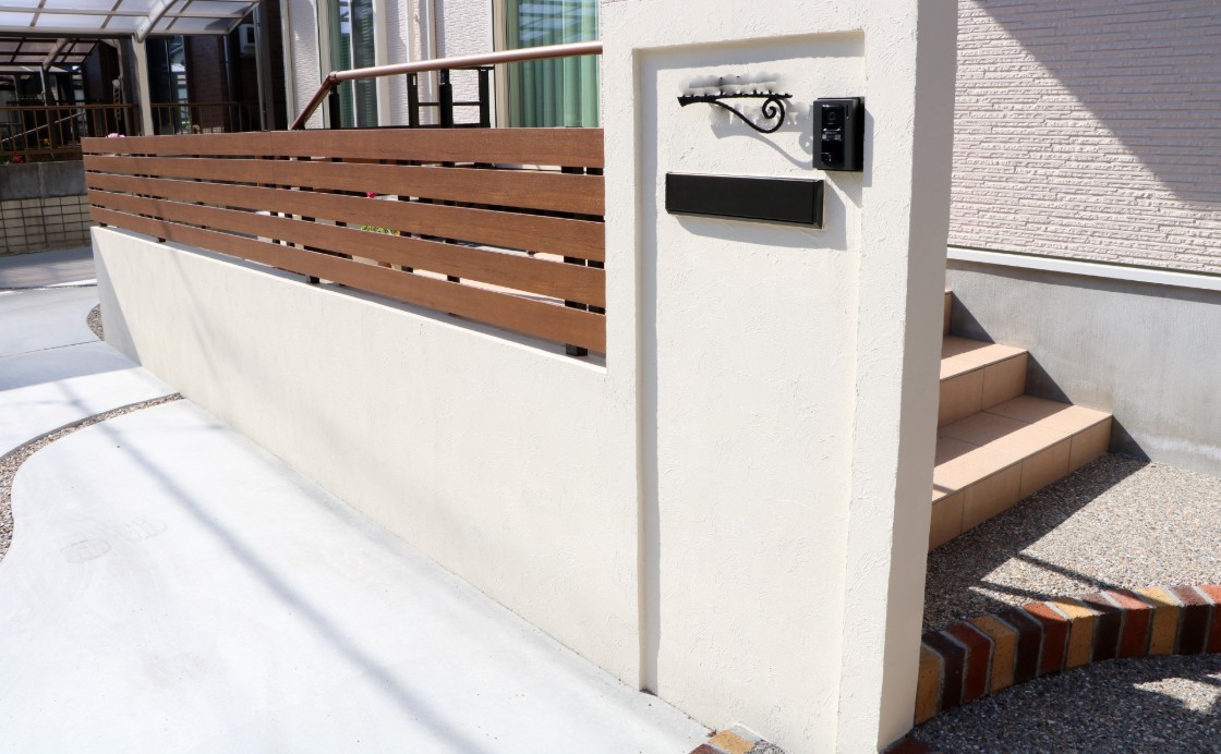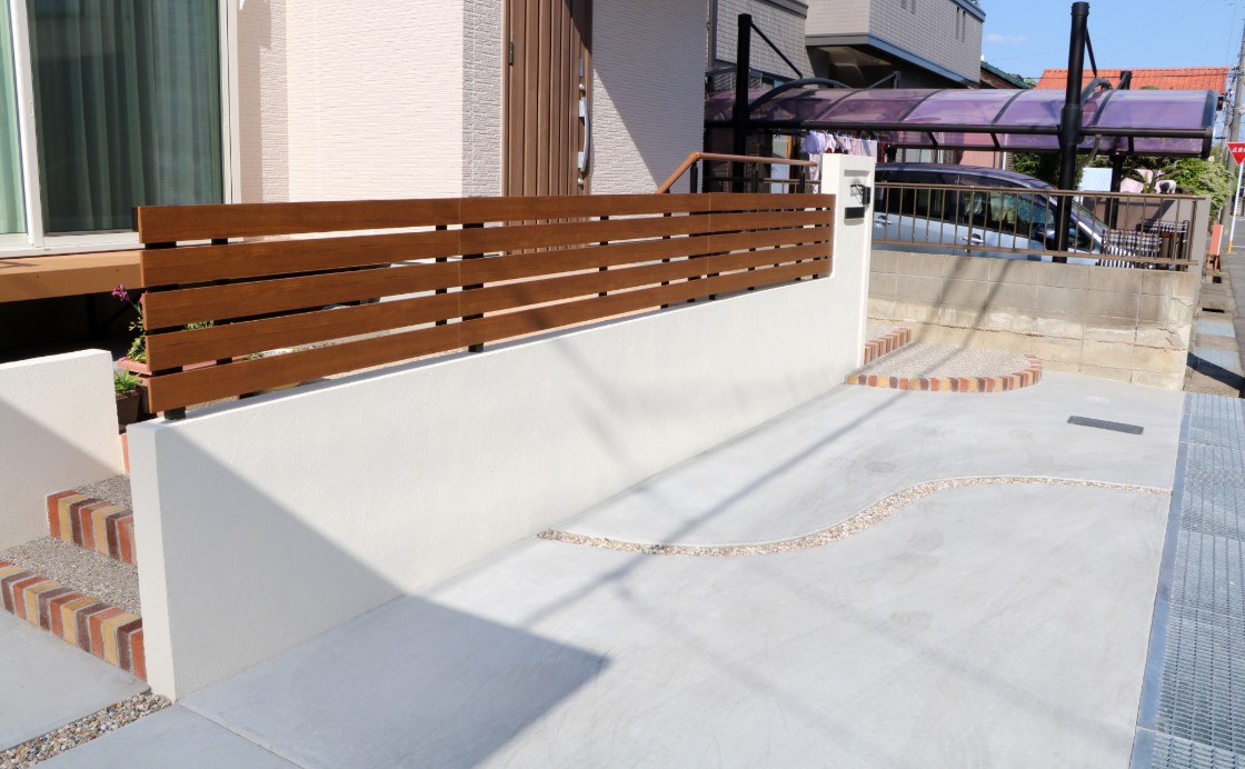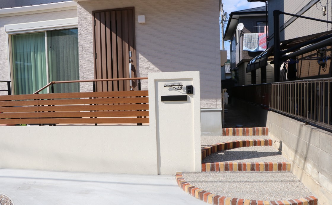 ランダムカラーの階段と木彫が特徴的なシンプル外構プラン