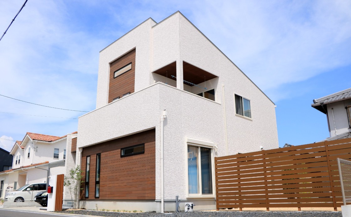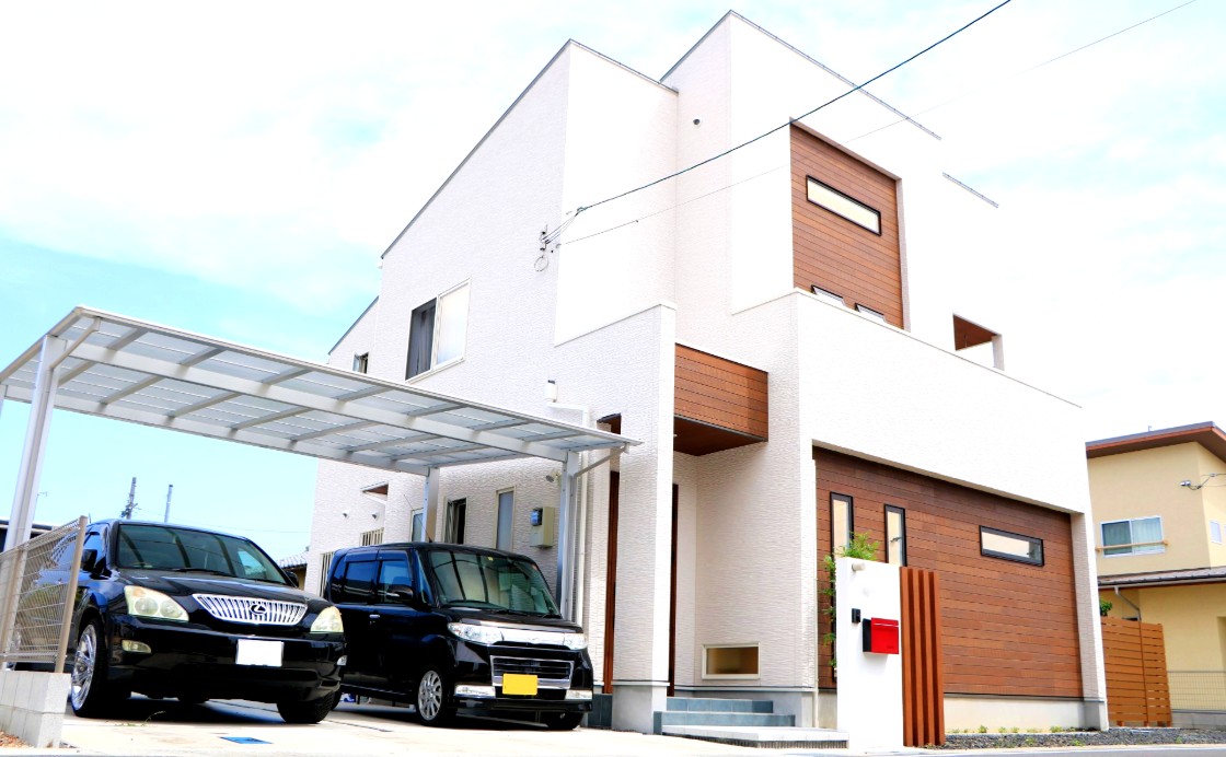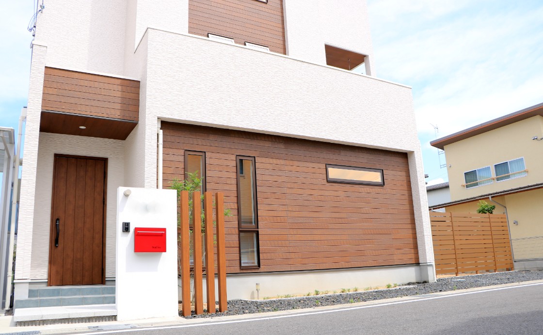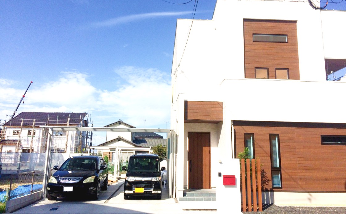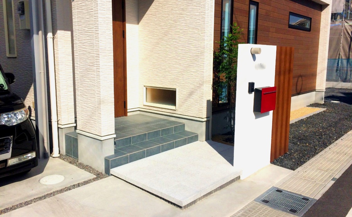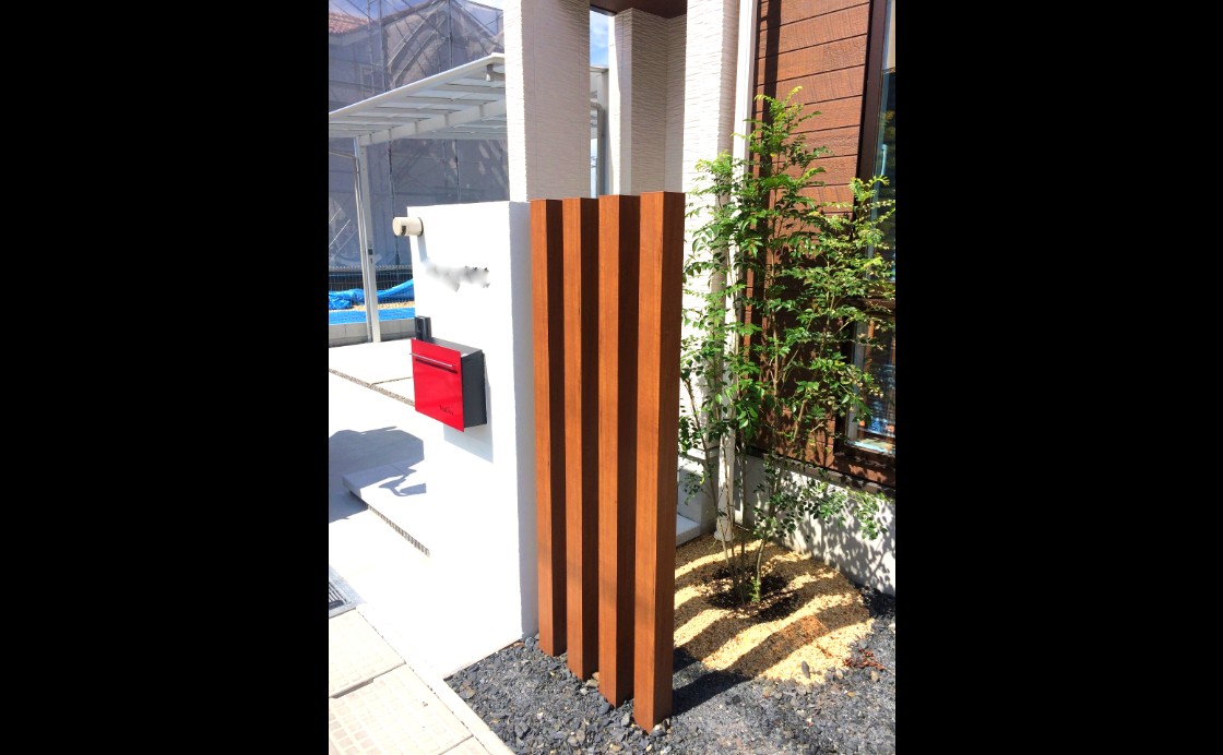 白ベースのご住宅に映える木彫に合わせ、枕木・フェンスも木彫に揃え、門柱にはワンポイントの赤のポストが際立つデザインに。駐車場には2台用のシャープなカーポートを備え、反対側の庭には目隠しになるよう背の高いフェンスを設置。お家でBBQができるスペースを備えました。色やスタイルが全体を通してまとまったシンプルなデザインです。