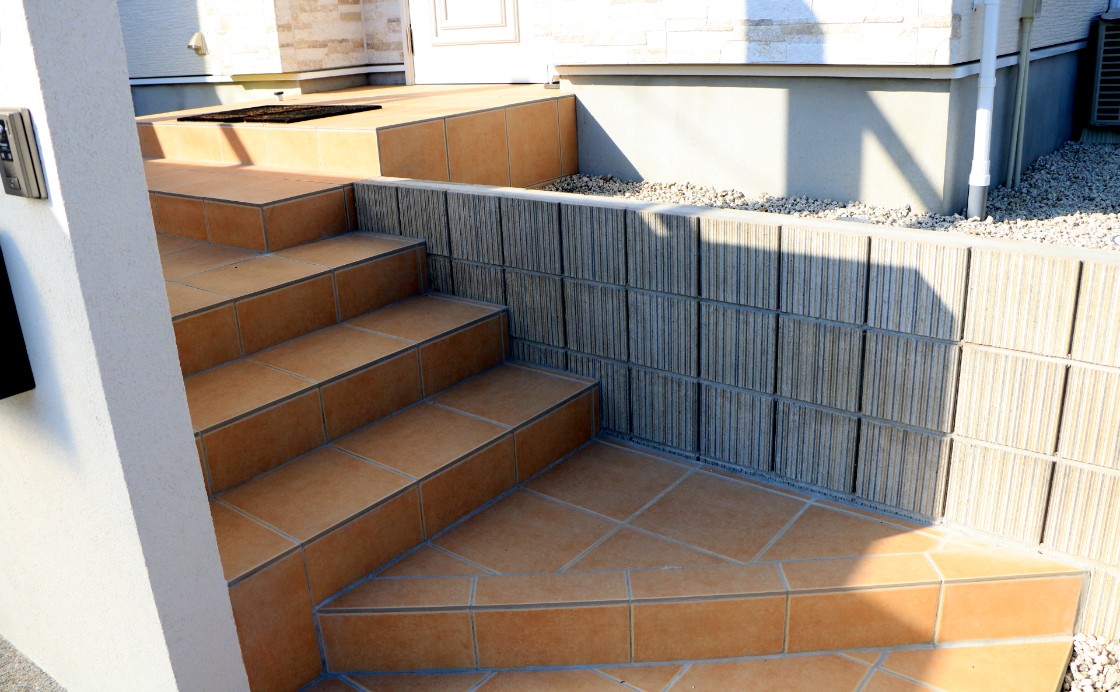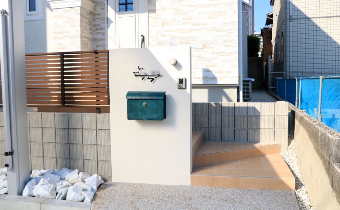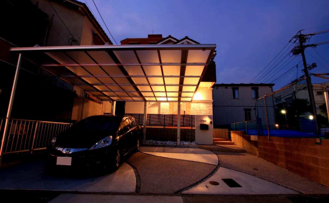 アプローチを含めて車を3台入れたいというご要望に合わせ、柱が邪魔にならない後方支持柱式のカーポートを設置しました。それにより両サイドにカーポートの柱がない為、3台分の駐車が可能となり、車の出入りもしやすくなりました。門柱部は白く塗り緑のポストを設置し、タイル階段は使いやすいよう形状を工夫しました。夜はライティングでカーポートの屋根を通して光が広がり、幻想的な雰囲気になります。