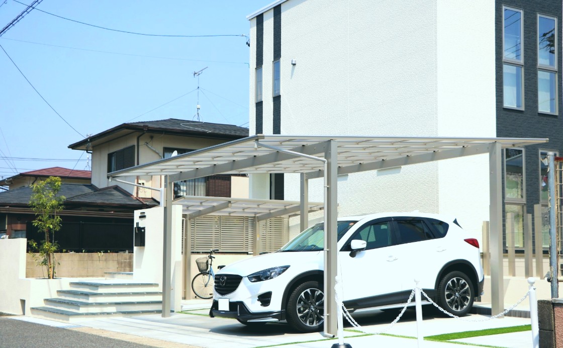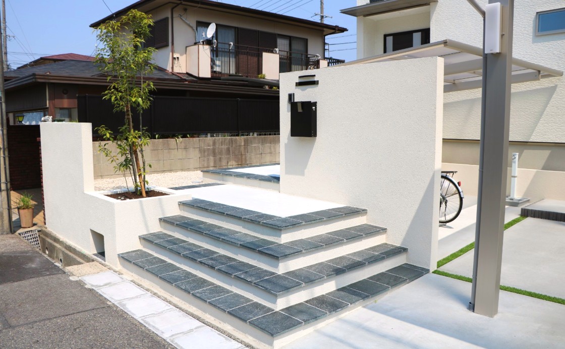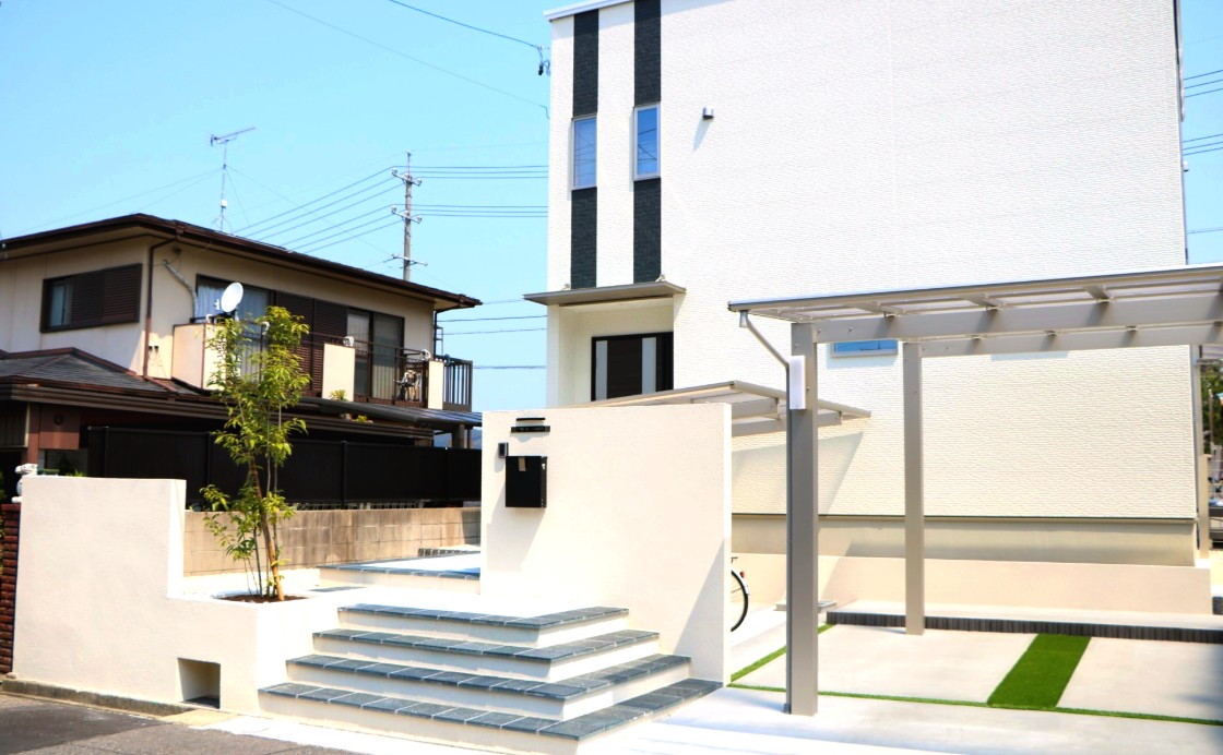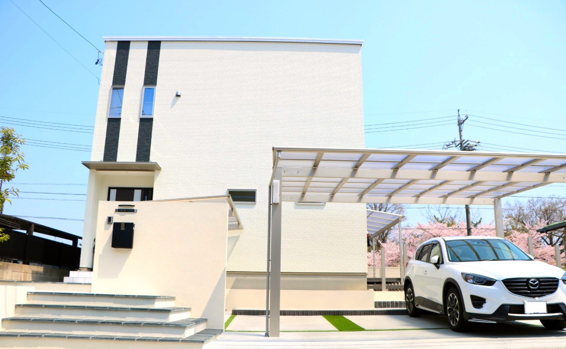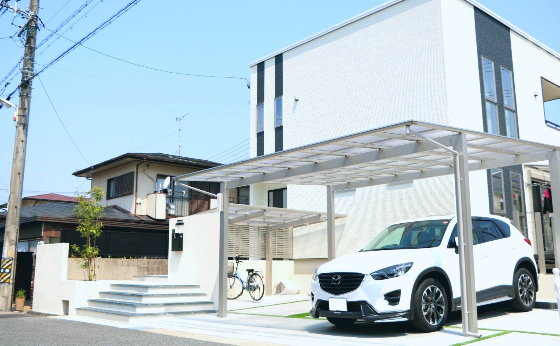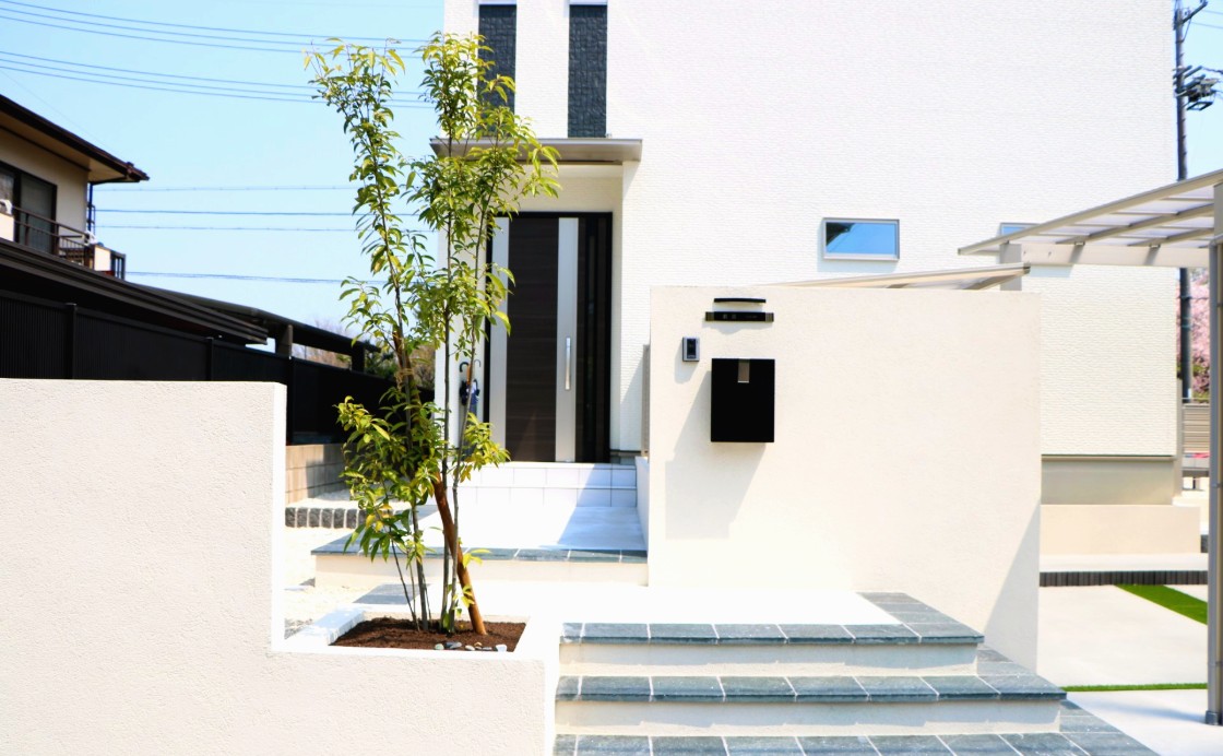 正面には塗り壁にてリビングと駐車場を仕切り、駐車場には縦連棟のカーポートを設置しました。お車と自転車を配置でき、リビングの目隠しにもなるよう設計しました。また塗り壁には枕木材や、横ラインで変化を持たせ、枕木材の後ろには樹木を配置、門柱の裏には水栓を置き正面からできるだけ生活感を見せないデザインに仕上げました。