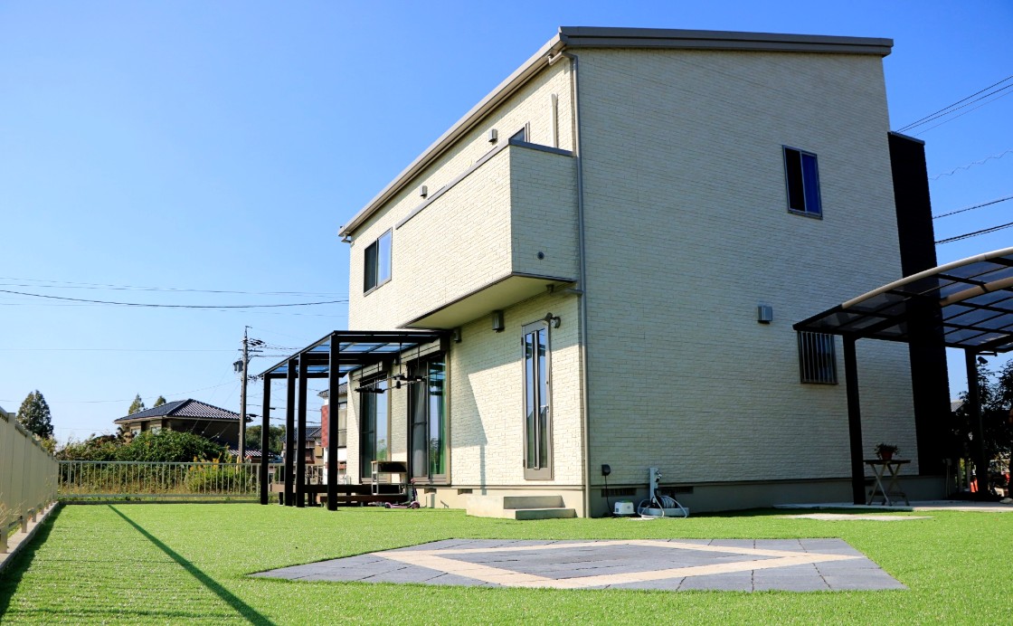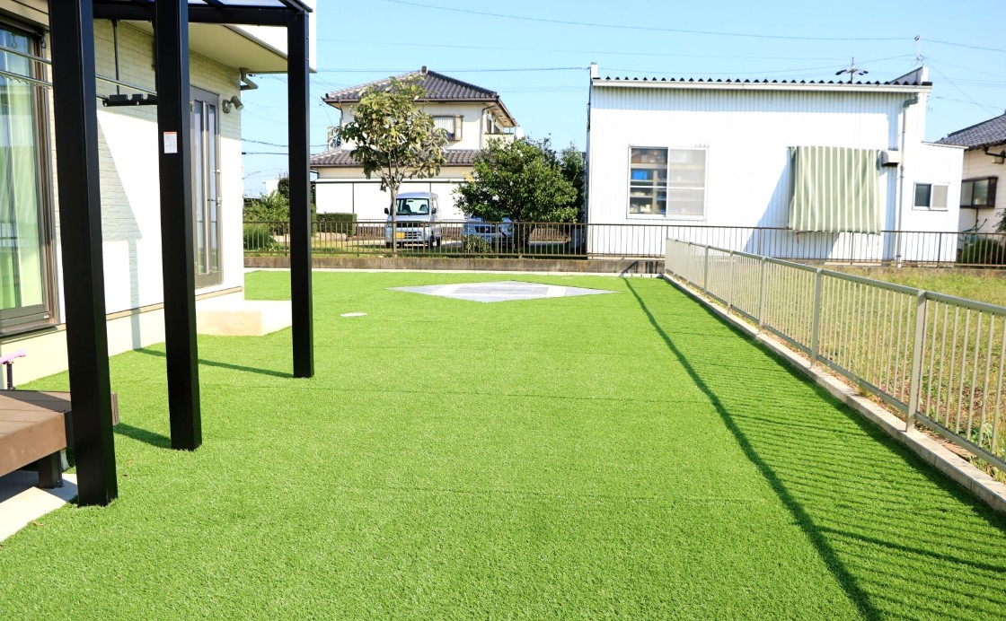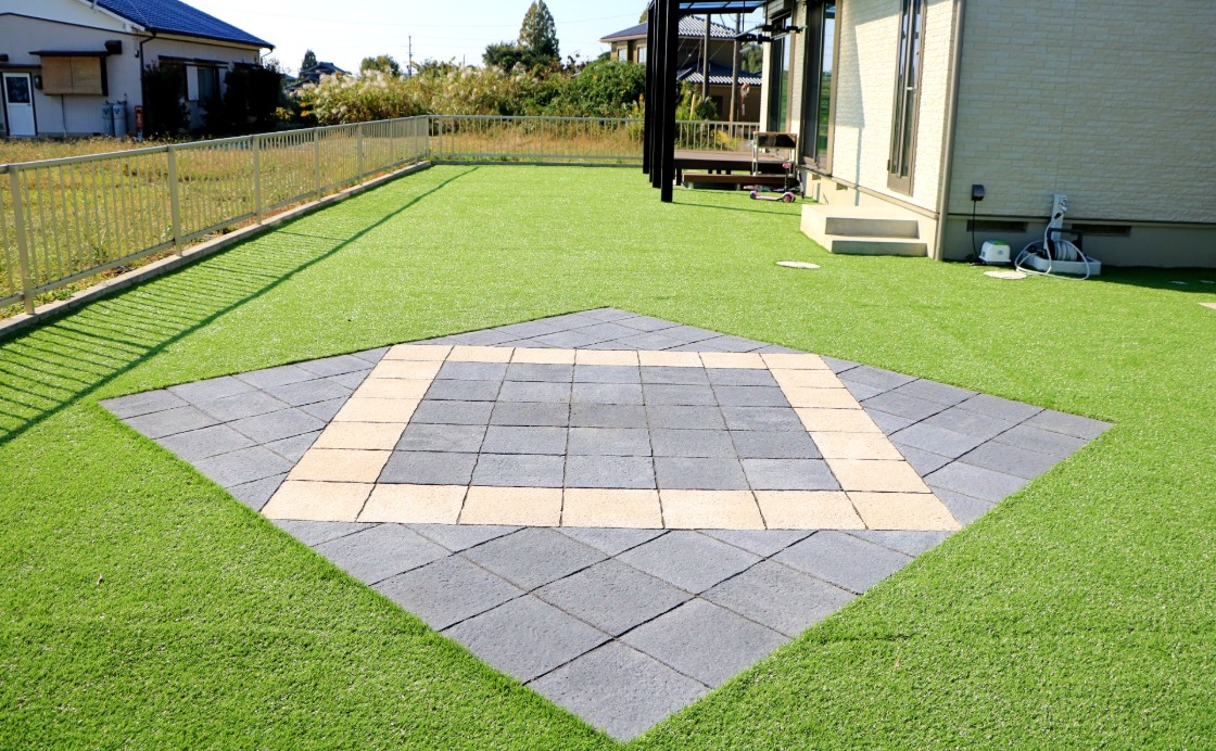 毎年の雑草対策から解放され、裸足で走り回りたくなるお庭にリフォームしました。お庭全体に人工芝を敷設し、平板を使用したBBQスペースを設置しました。単色ではつまらないと言うお声を頂き、2色使いでオリジナルのBBQスペースになりました。またテラス屋根なども設置し、ご希望に合わせた使い勝手を実現しました。人工芝の上にテントを張れば自宅キャンプもできちゃうお庭です。