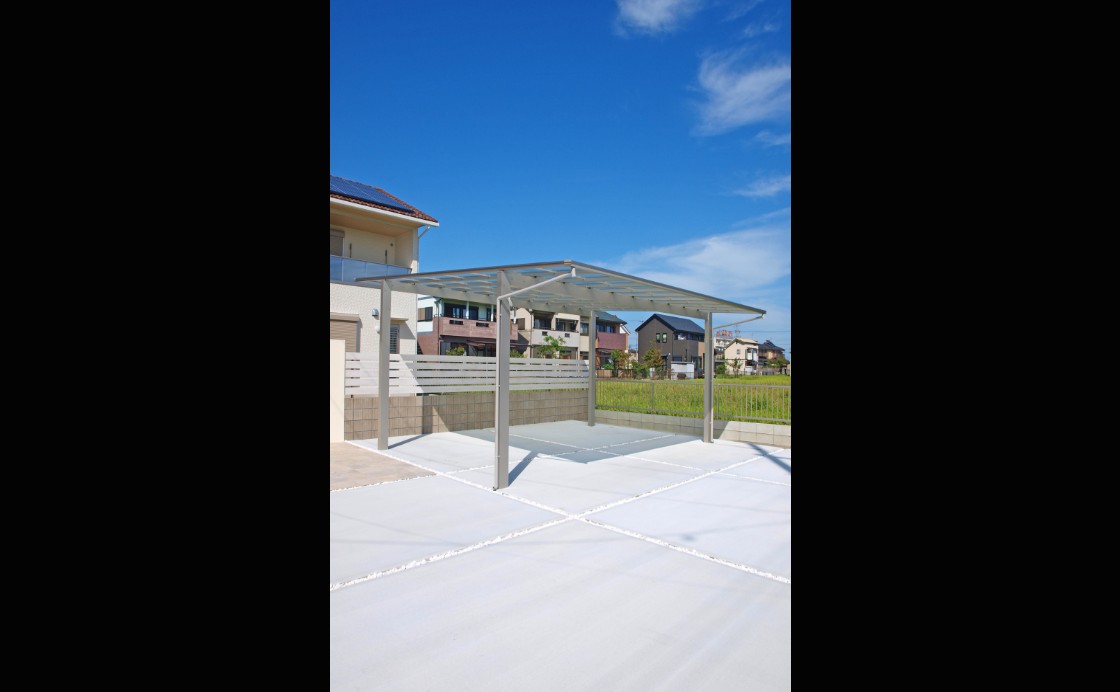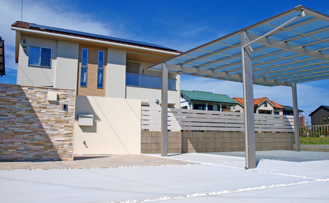シンプルモダンなご住宅に合わせたシンプルプラン。駐車場部分は広々使用できるよう土間コンクリートで舗装し、2台用のカーポートを設置。ファサードだけは天然石と塗装で特徴をだし、門扉を取付けしました。ブロックとフェンス、門扉で外部からの侵入を防ぎつつ、プライベート空間はしっかりと確保した使い勝手の良いクローズ外構になりました。