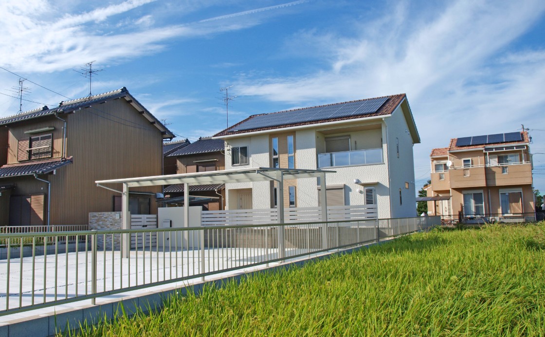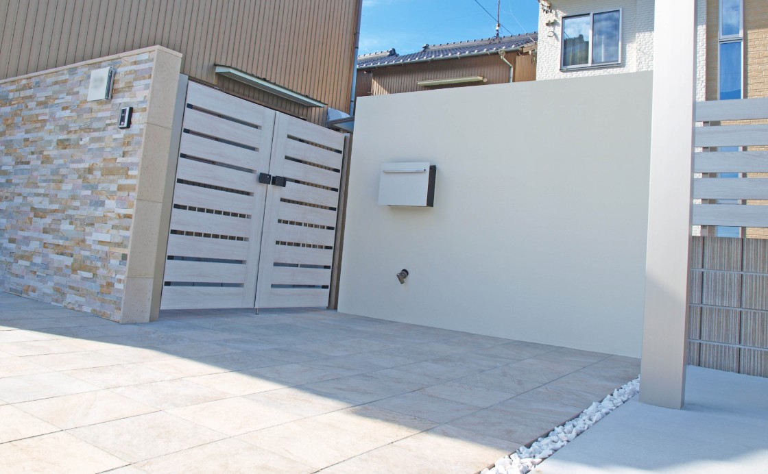 色と素材を変えた特徴的なファサードのセミクローズ外構