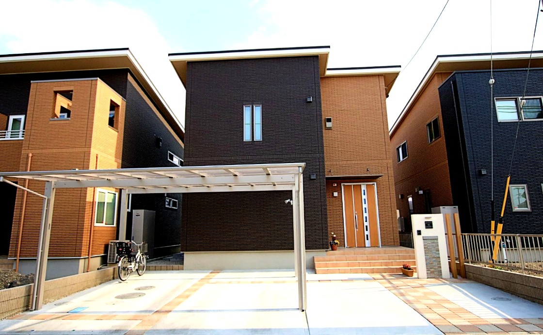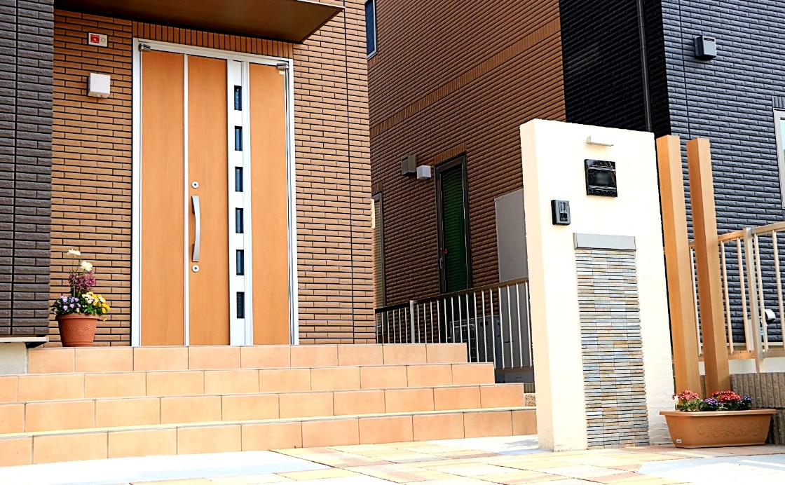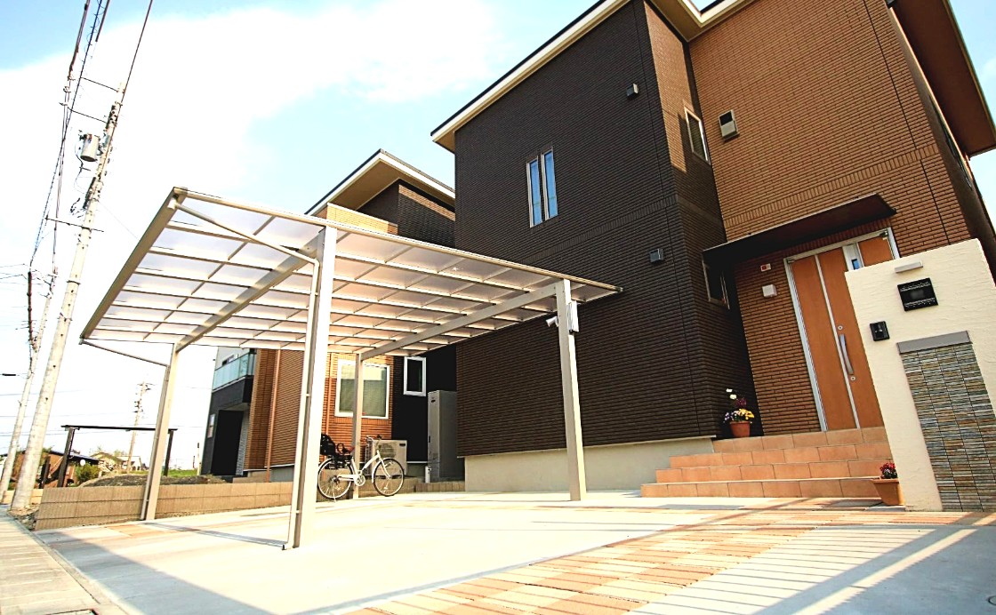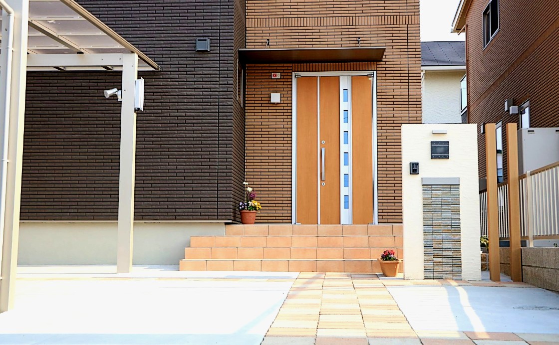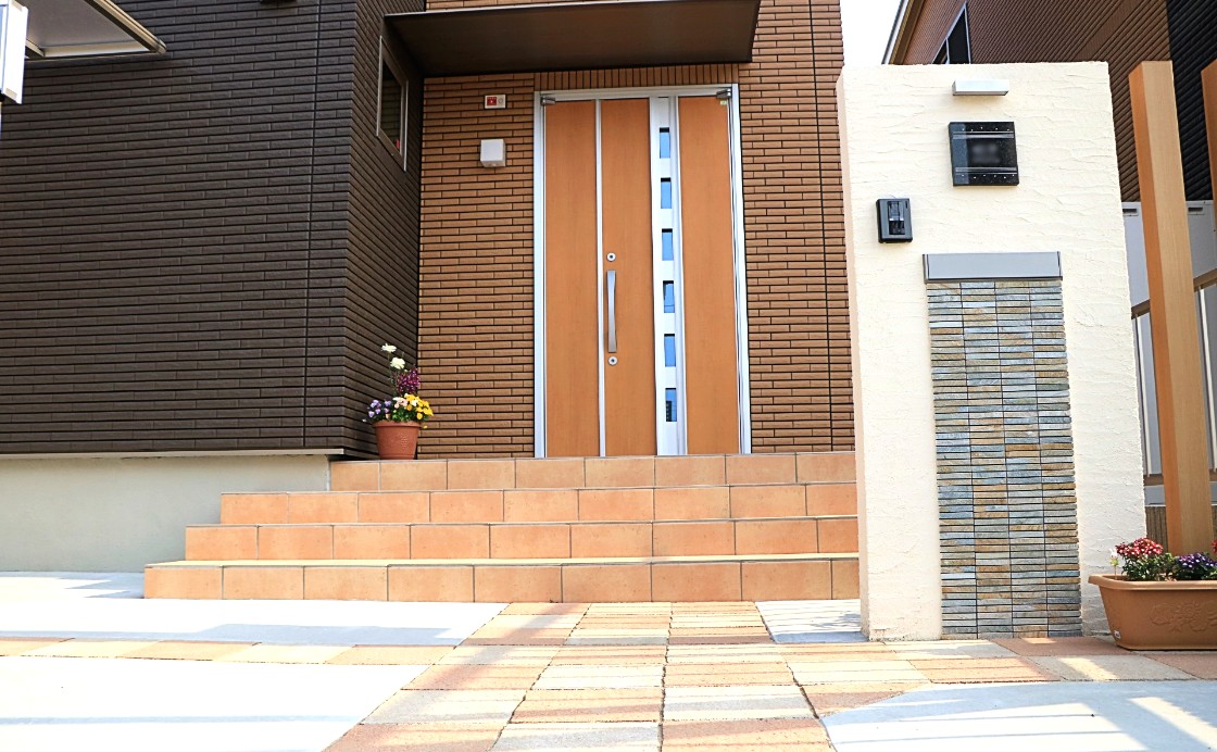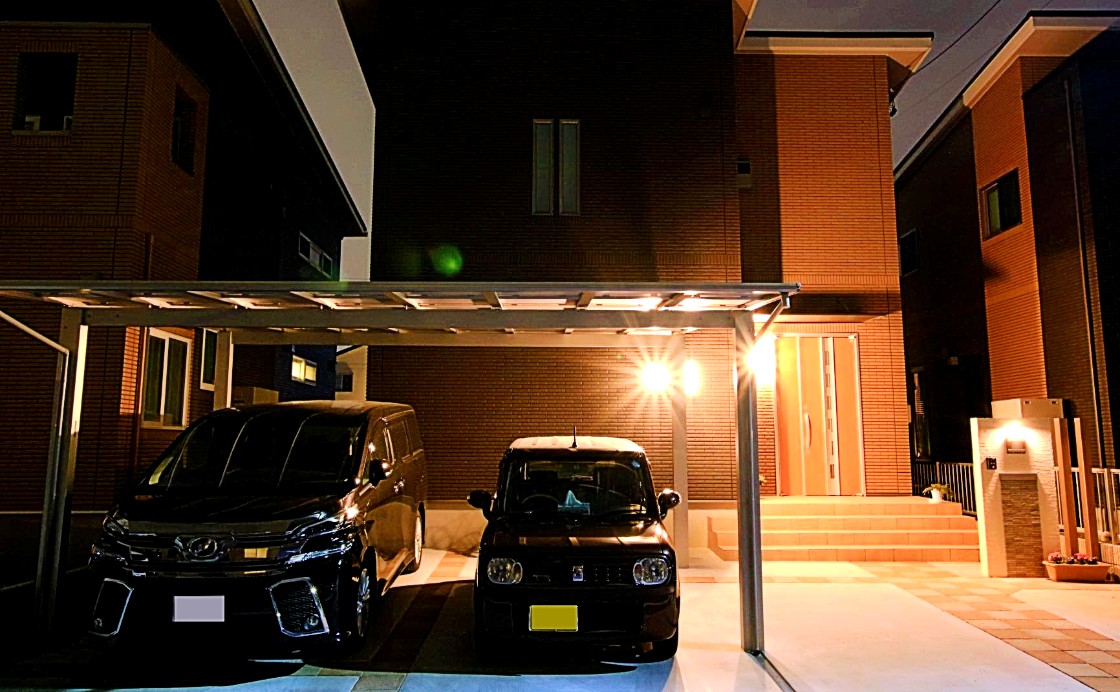 オレンジ色の外壁に合わせ、同色系の平板を市松模様に配置した特徴的なデザイン。プラン自体はシンプルに仕上げ、車は3台停められるよう設計しました。2台用の大きめのカーポートには自転車やバイクも配置できます。門柱には塗装だけでなくモザイクタイルを貼り付け立体感を演出。そして駐車場・アプローチ・門柱など、各所に照明を配置し人感センサーで使い勝手と夜の演出にもこだわりました。