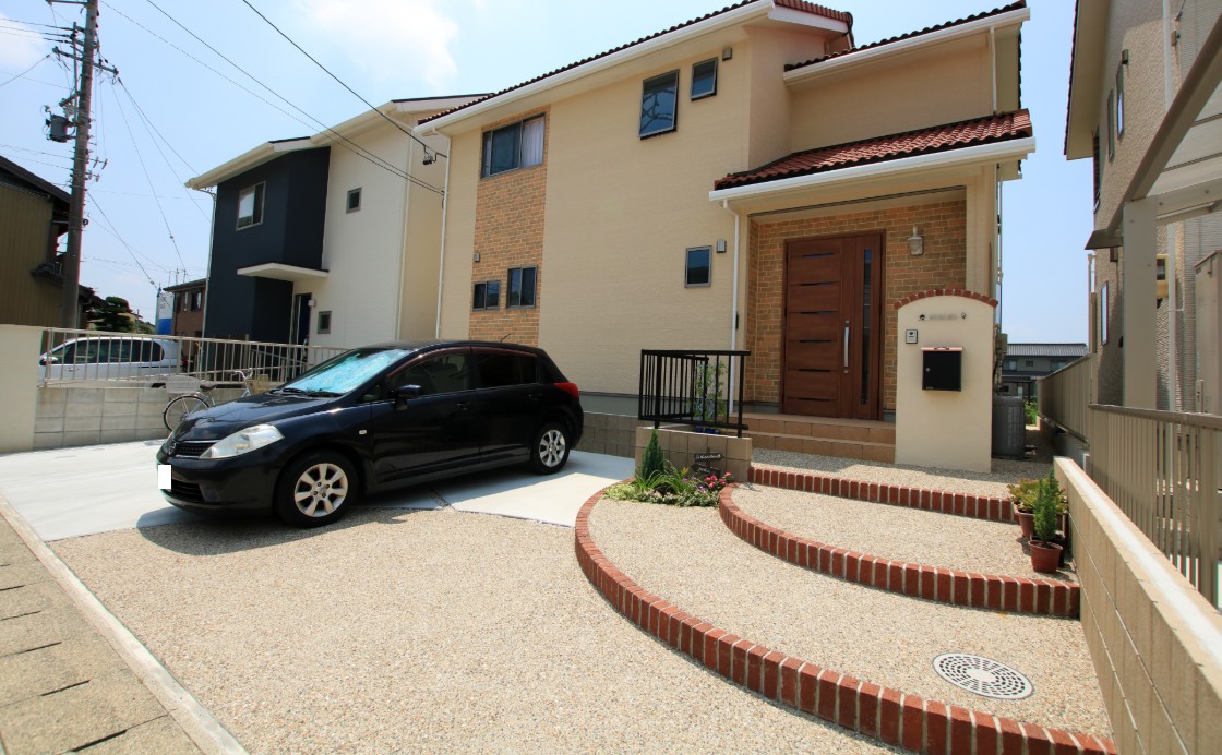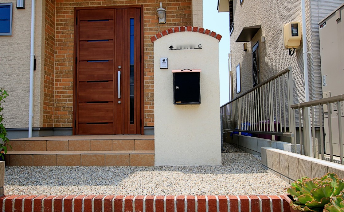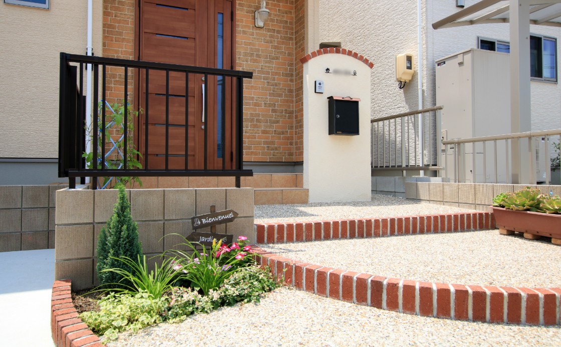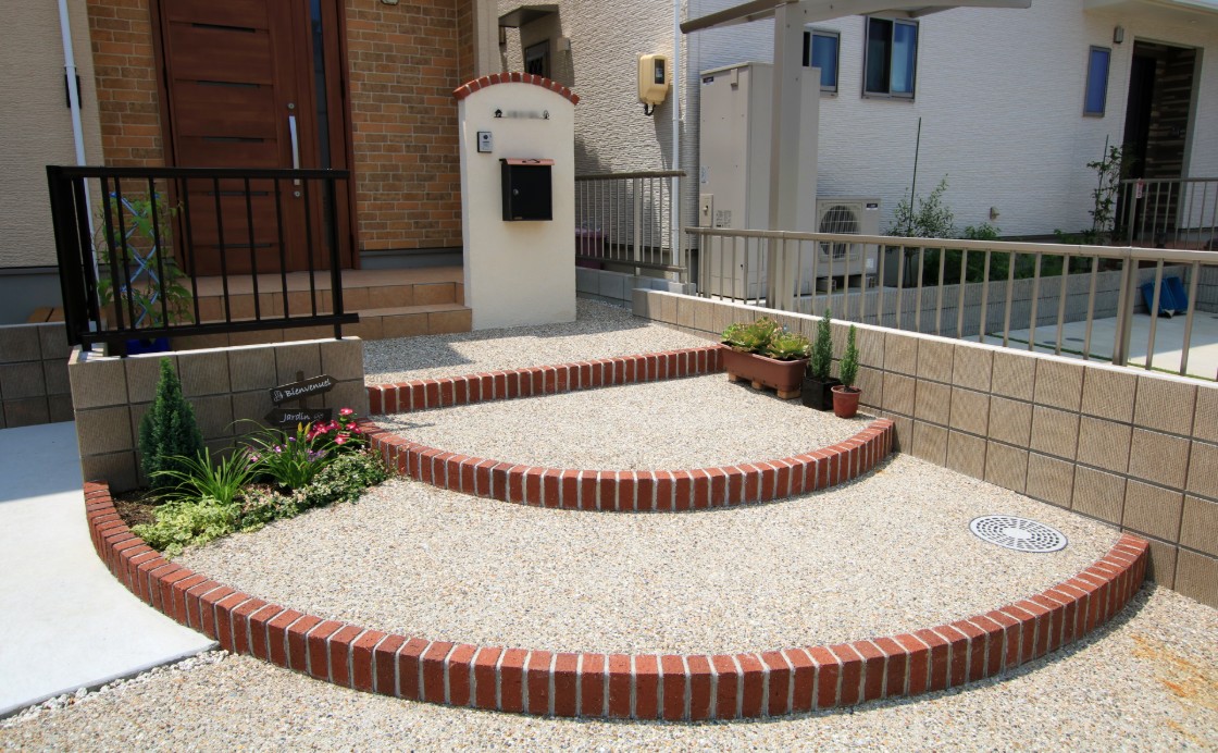 赤い屋根のご住宅に、同色のレンガ階段を設置した印象的なアプローチプラン。レンガ階段は緩やかなカーブを加え優しい雰囲気を出しつつ、踏面は奥行を大きくとっている為、お子さんでも年配の方でも上り下りしやすく計算しております。また車を駐車する際に、アプローチの階段が邪魔にならないように考えてプランしました。階段の一部には樹木や下草などのスペースも用意し、門柱には階段と同じレンガを笠木に使用しました。全体では色の統一感があり、印象的なデザインになっていると思います。