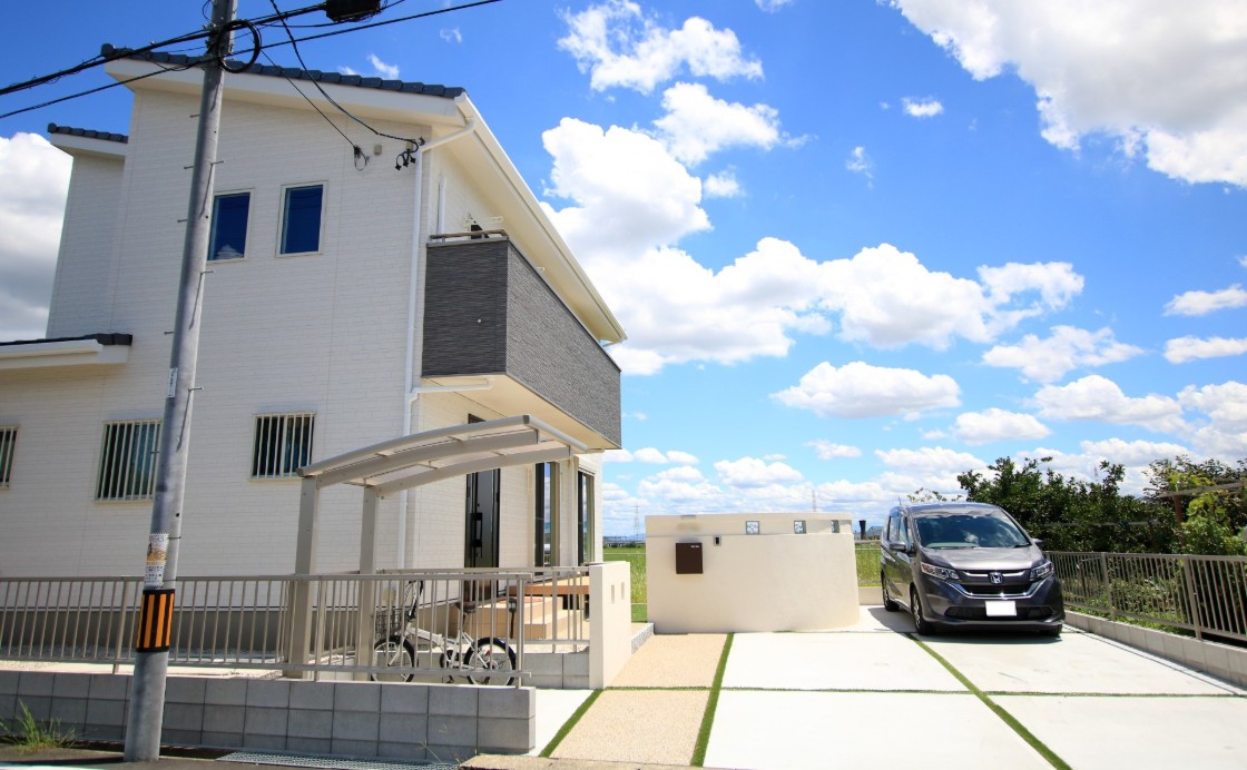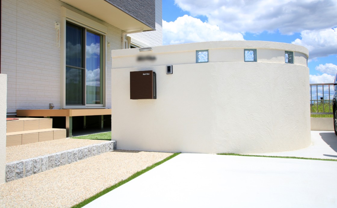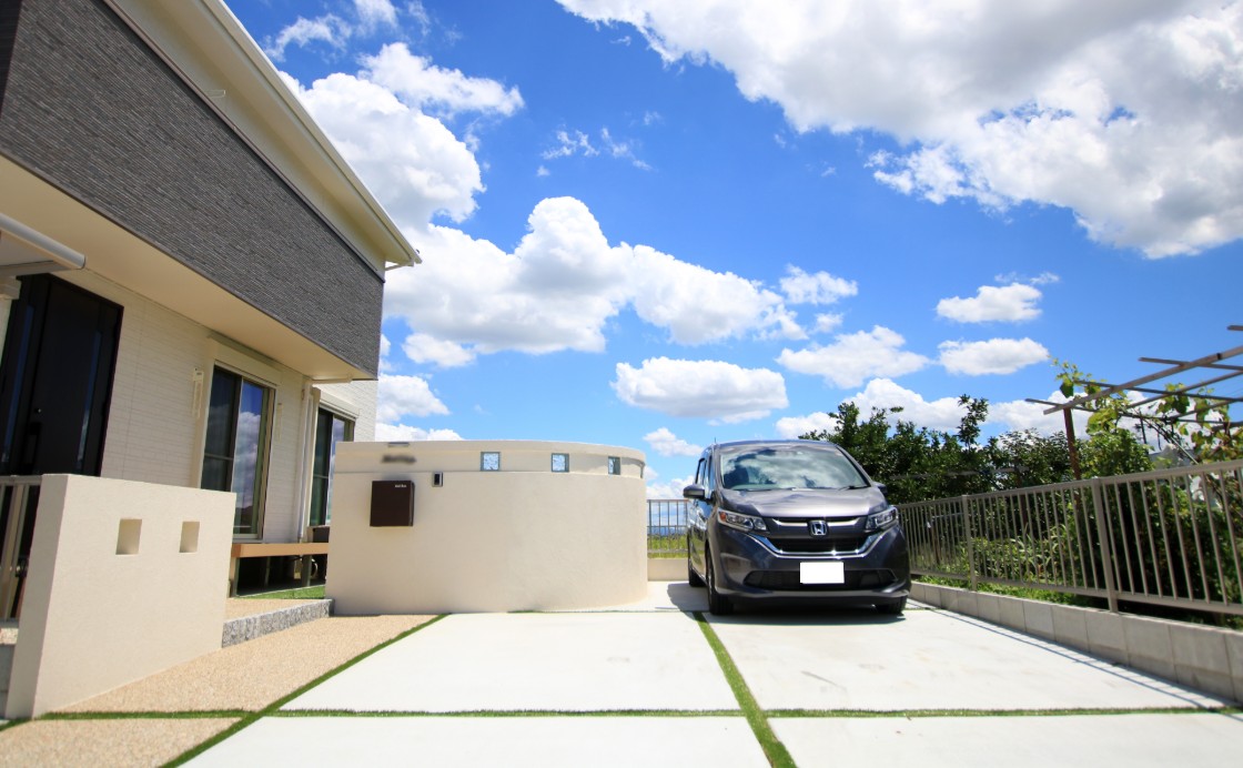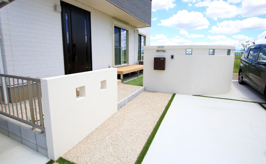 駐車場は3台分設置し、自転車置き場もしっかり完備したオープン外構プラン。自転車置き場にはサイクルポートも設置し使い勝手良く、お車も来客用も含め3台まで駐車できます。またお庭には人工芝とウッドデッキで上質な日常を味わうことができます。また何といってもこの門柱が特徴的になりました。緩やかなカーブにガラスブロックを埋め込みさわやかに、また目隠しとしても機能を発揮します。アプローチや駐車場のスリットにも人工芝を敷き、緑が映えるプランになりました。