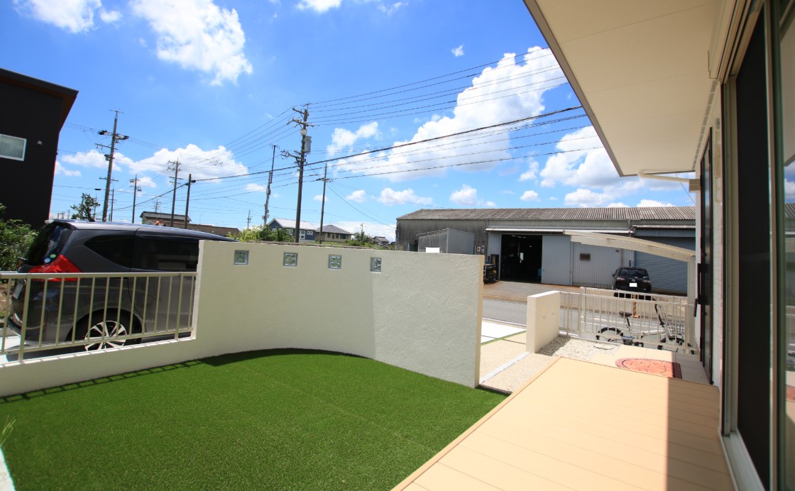 さわやかな色合いに青空と人工芝が光るエクステリアプラン