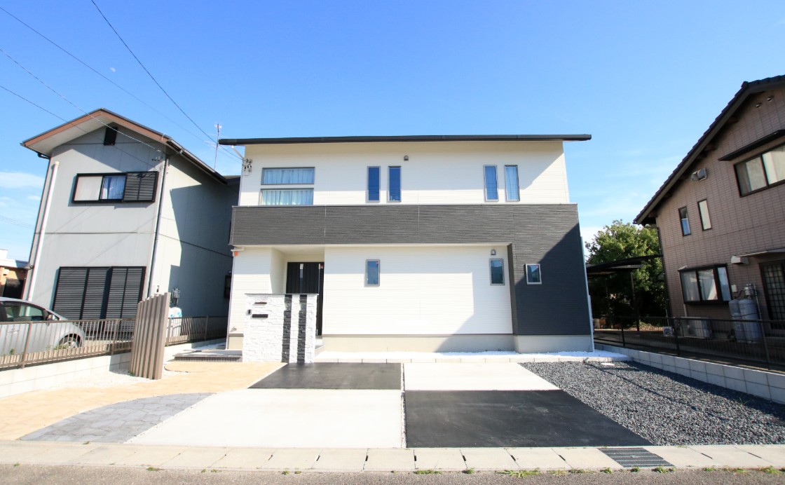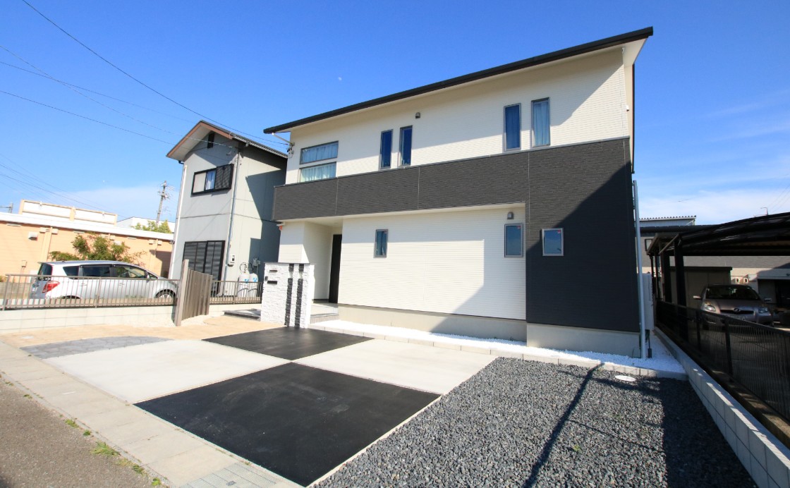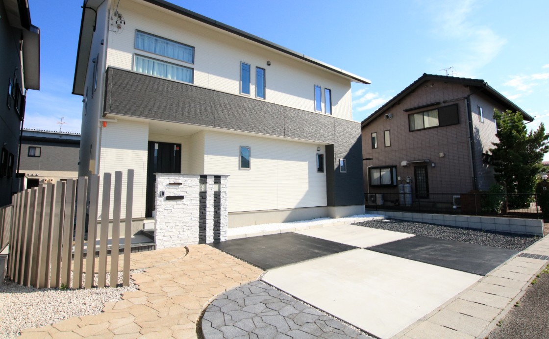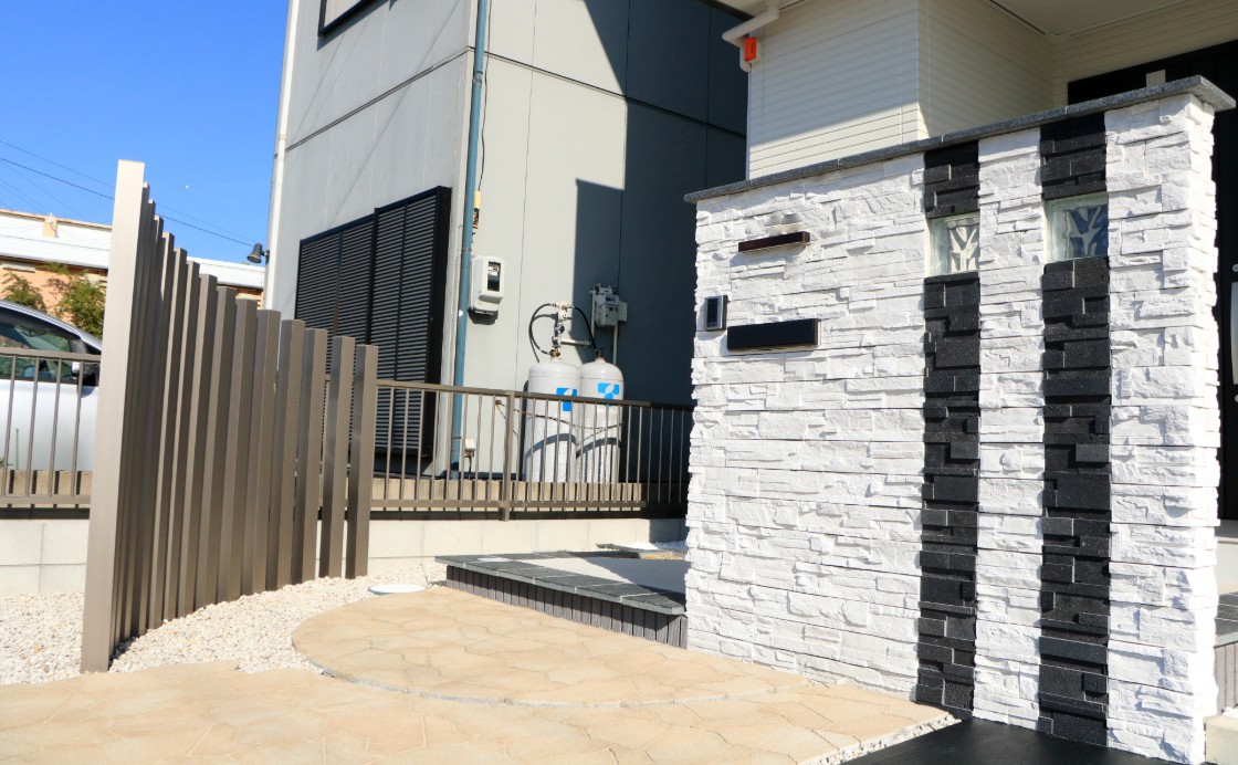 間口の広い敷地に3台分の駐車場を設置。1台は砕石の駐車場ですが、2台分の一部はカラーコンクリートを採用。またアプローチには乱形石調の平板を曲線で敷設し、枕木材についても、曲線での配置に流れるような高さ違いで設置。こちらに樹木を植えても雰囲気がよくなってくるかと思います。門柱は天然石を貼付け、ガラスブロックを埋め込み、そして縦の二つのラインのみ色を変えた仕様になっています。立体的な門柱になり全てが目を引くデザインになりました。