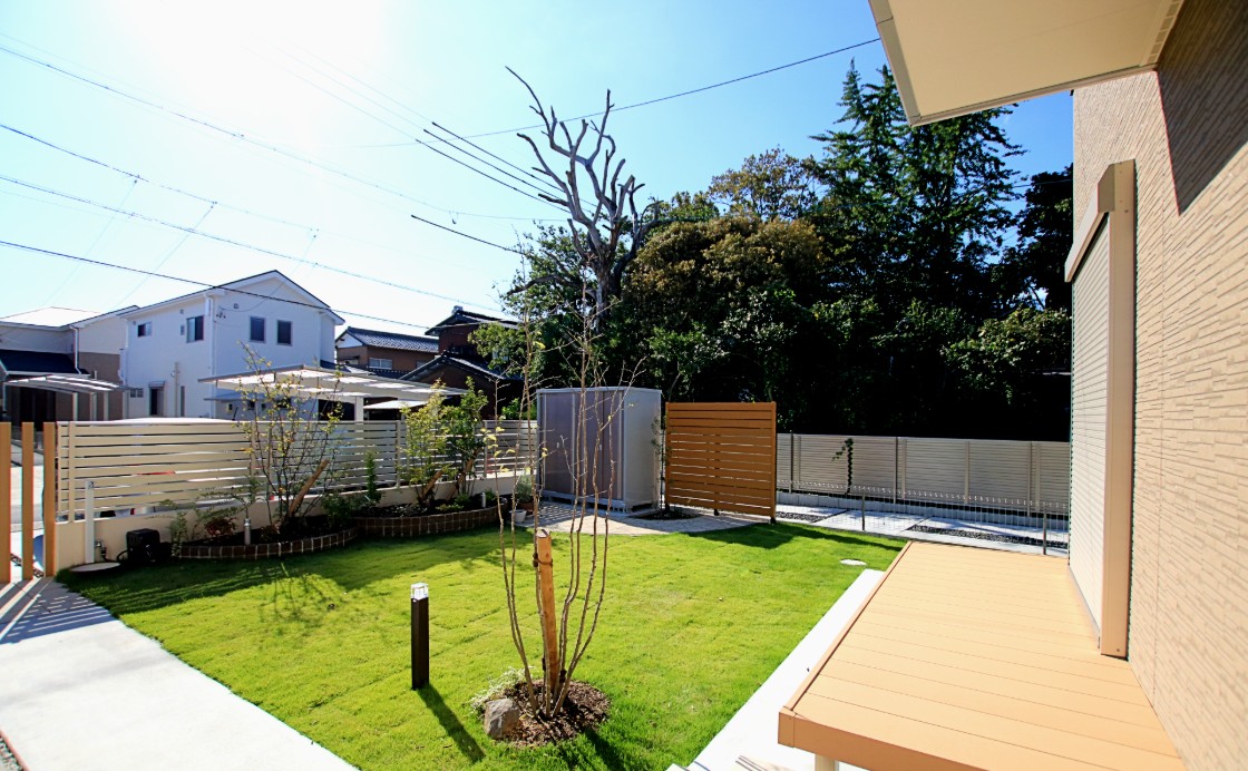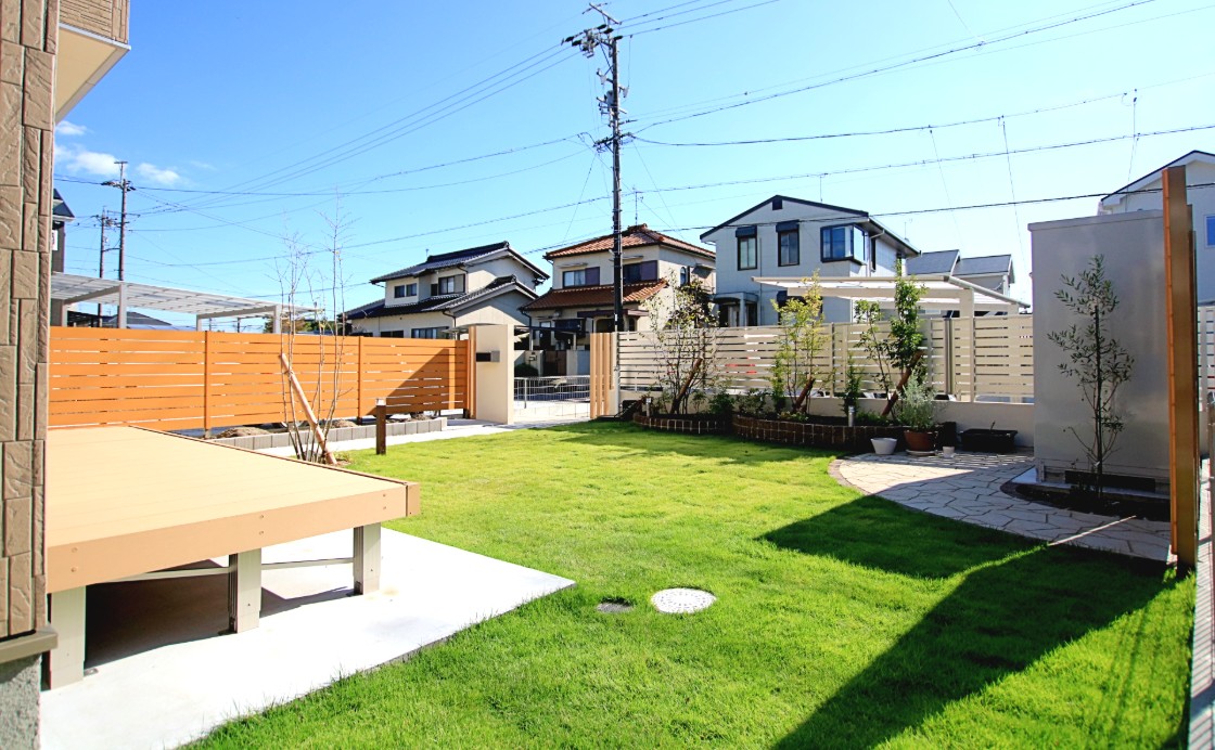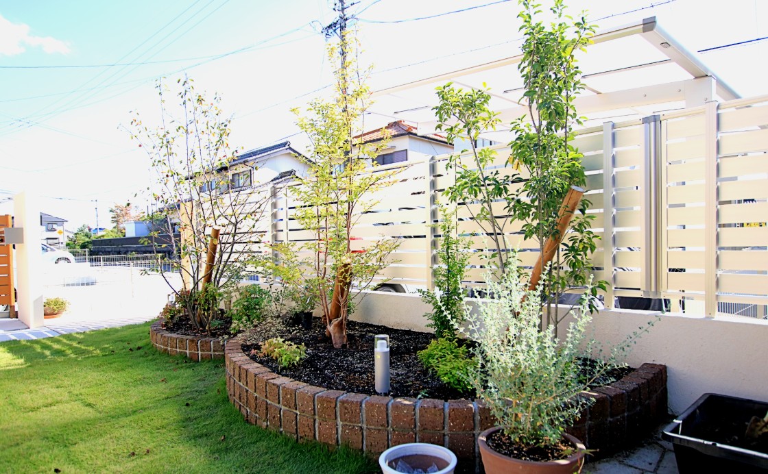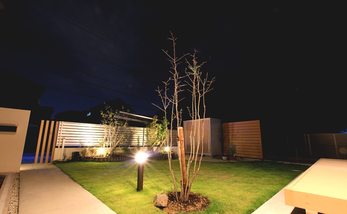 分譲住宅の広いお庭を樹木と芝生で使いやすく、見栄え良くリフォームしました。自宅の庭でテントを張ってキャンプもでき、もちろんBBQもできます。樹木はできる限り端に寄せ、リビングから見える位置に配置、また単調にならないようレンガ花壇は段違いで設計しました。奥行についても手の届く範囲で設計している為、手入れも簡単です。物置スペースは平板で舗装し雨の日でも使いやすく、周りのフェンスは半目隠しタイプを使用し近隣の目を気にすることもありません。ウッドデッキも完備し、縁側風に足をかけて使用することを前提にデッキ下のコンクリートも大きめに打設しています。夜は樹木が光る幻想的なプランです。