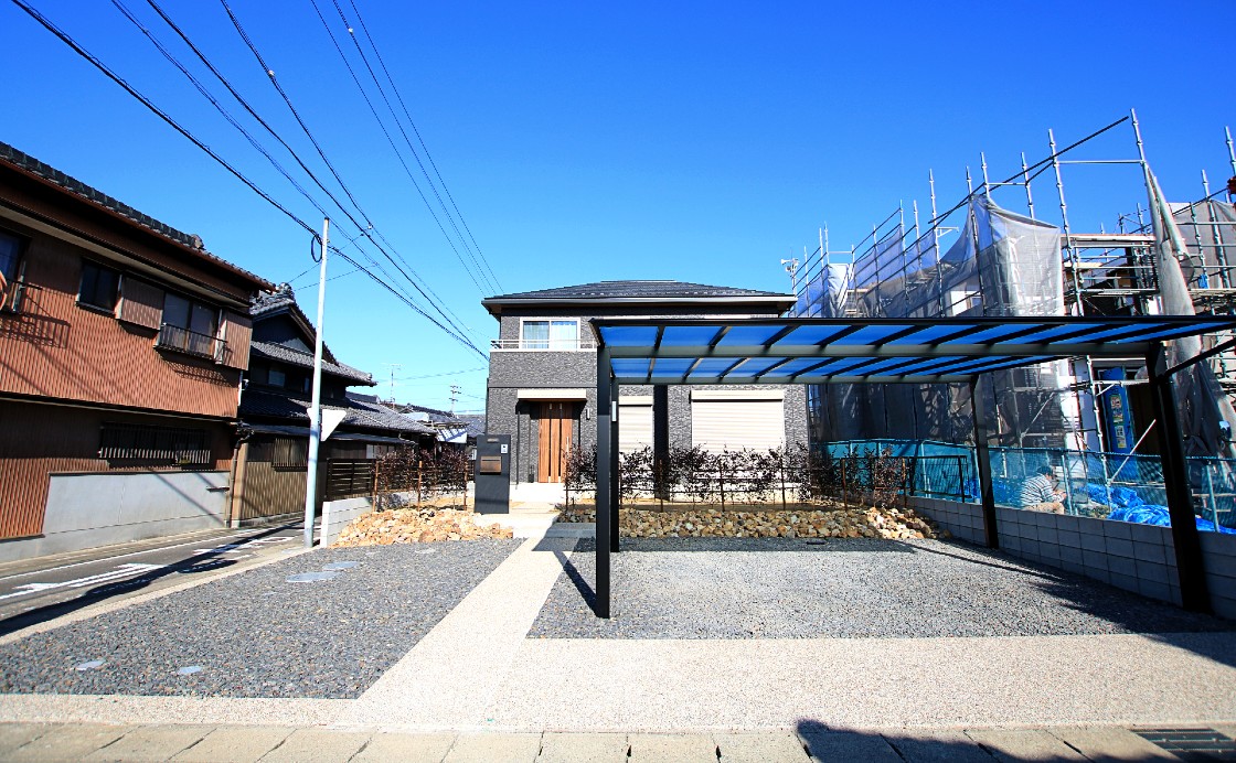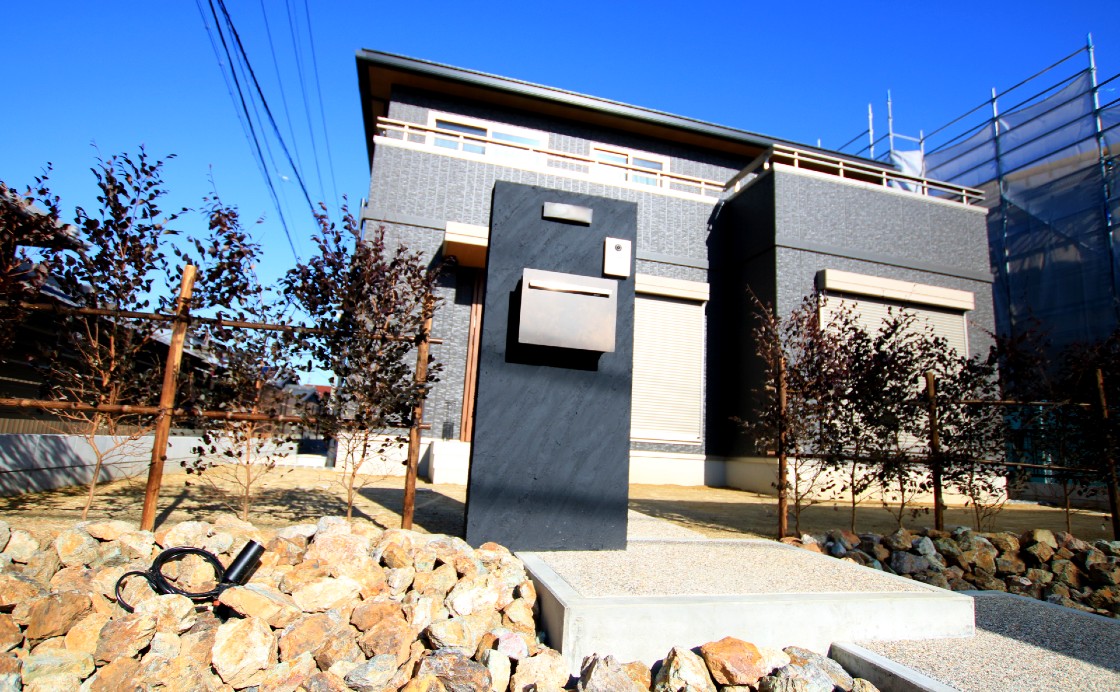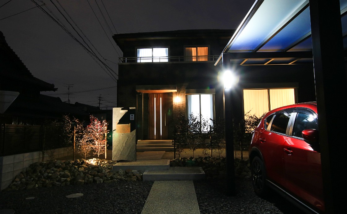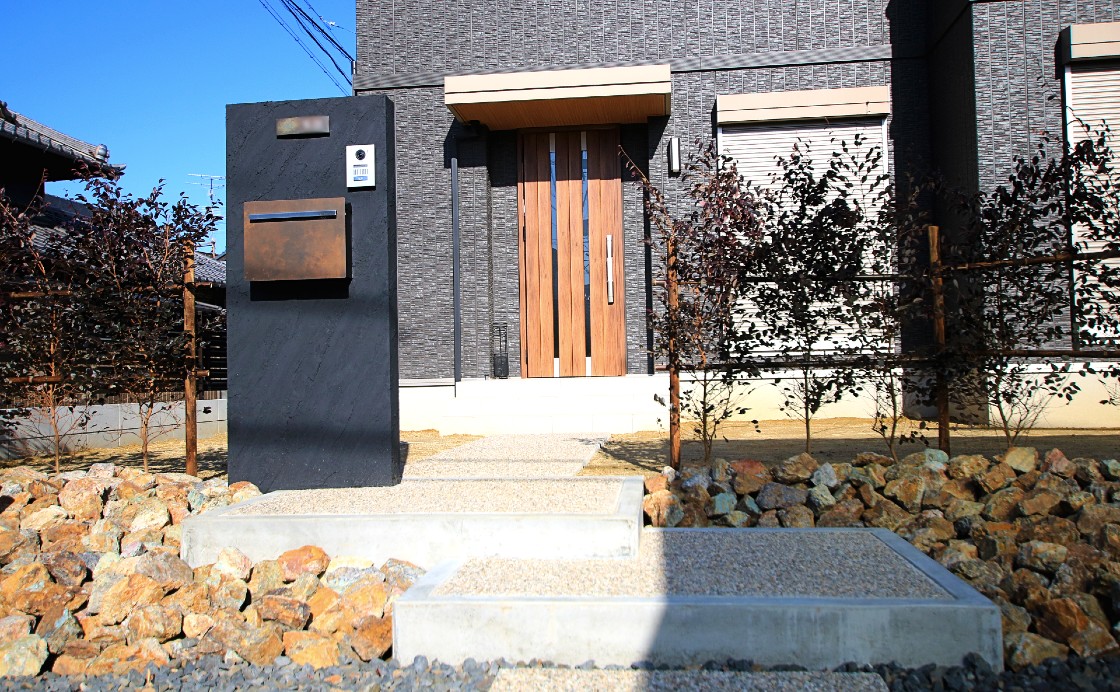 道路から高低差があるご住宅については何らかの方法で階段と土留めをしてあげる必要があります。多くはブロックなどで土留めをしますが、今回は大きめの石と垣根を配置しました。造作物がないことで高低差を自然な雰囲気で整えることができ、こだわりのアプローチ階段がより印象的になりました。正面でなく斜めに配置した階段は踏面を洗出し仕上げ、周りはモルタル塗装で個性のあるデザインに。またカーポートと照明も配置し、使い勝手良くまとめました。