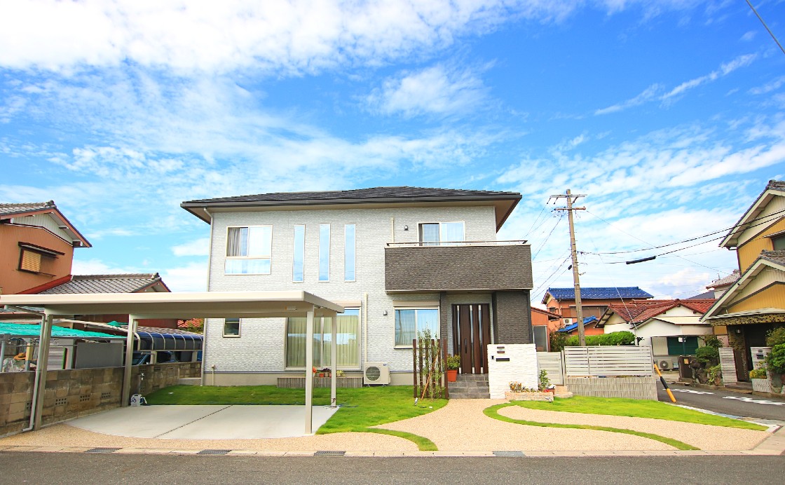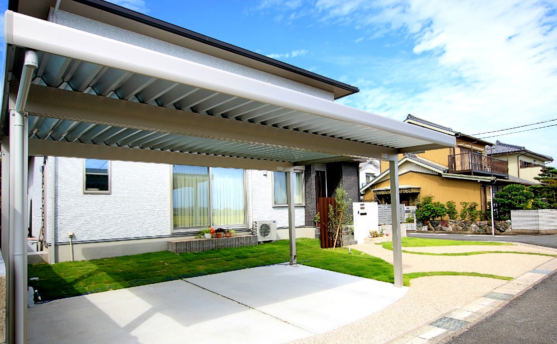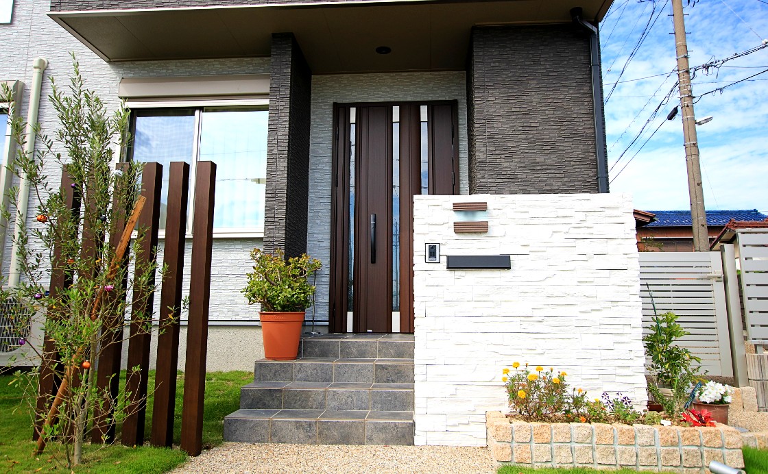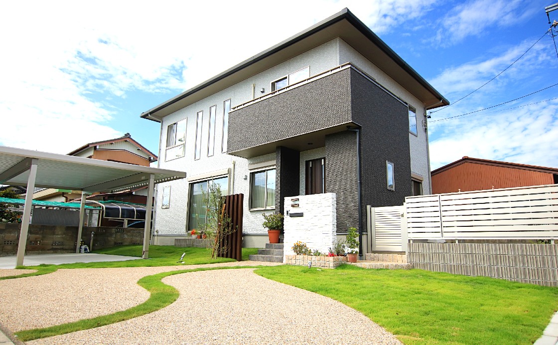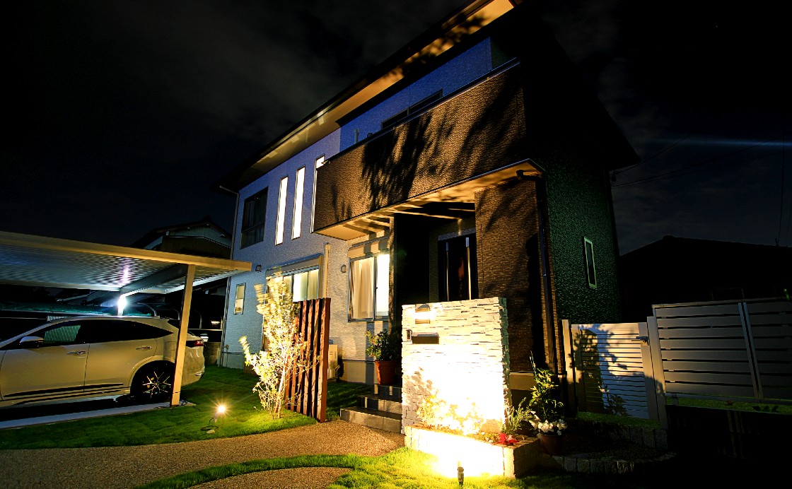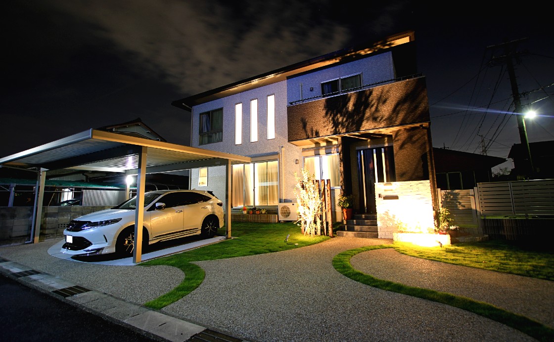 幅広い間口がゆったりした雰囲気を醸し出すシンプルプラン。フルオープンなので圧迫感がなく、緩やかなアプローチと緑の芝が目を引きます。また駐車場にはセッパンカーポートを設置し、柱には照明を取付け。掃き出し窓からは出入りしやすいよう化粧ブロックで階段も造作しました。ファサードは天然石と、枕木材をバランスよく配置し、勝手口を設けたクローズスペースも作りました。ここで菜園など楽しむことができます。広く使え、バランスよく、そして使いやすいプランになりました。
