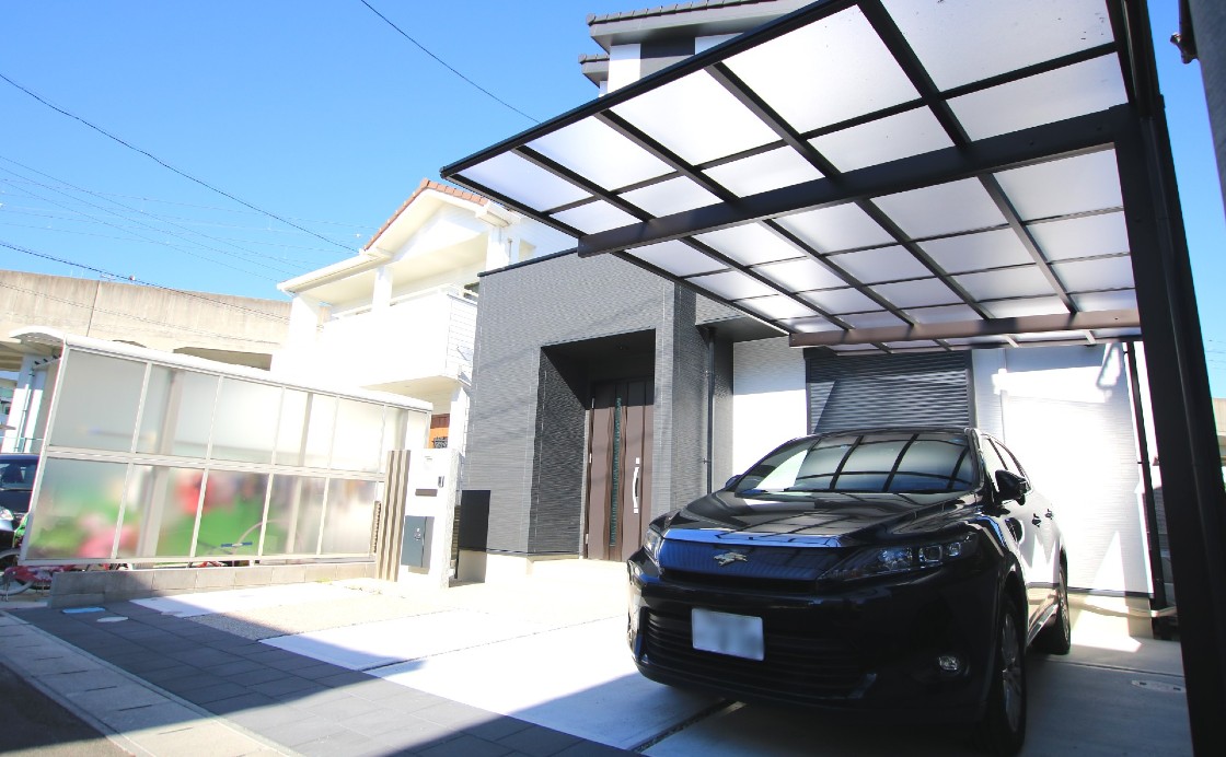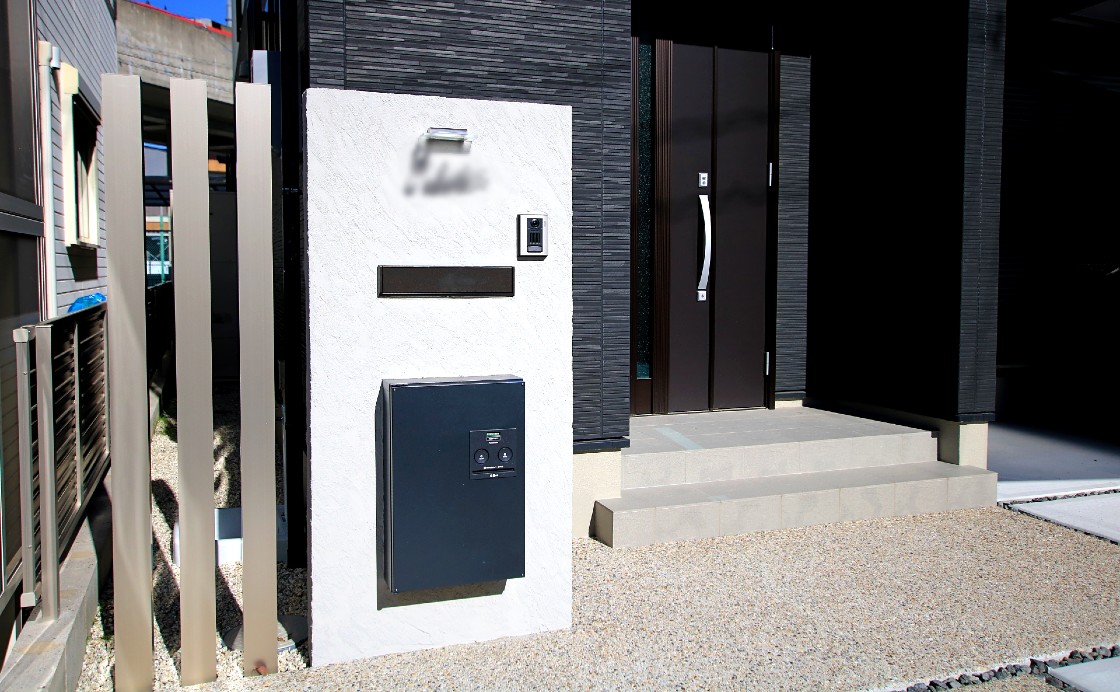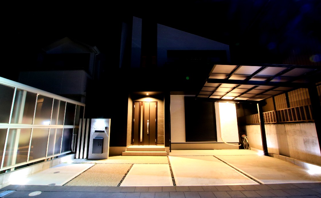 全体をモノトーンでまとめたモダンプラン。ご住宅の外壁に合わせ使う色は黒・白・シルバーにまとめ、濃淡をはっきりさせることでグッと引き立つお家になりました。カーポートは片側柱のフラットタイプを黒で配置し、門柱は白く塗装し、ポストと宅配ボックスをブラックで統一。隣にある枕木材はシルバーで奥にあるフェンスと同色に揃えました。駐車場は土間コンクリート・洗出し・そして車乗り入れ専用の平板を使用しました。その部分がいいアクセントになりました。夜には門柱灯と埋め込みライトを4カ所設置することで照明のバランスもとれ、使い勝手良くなりました。